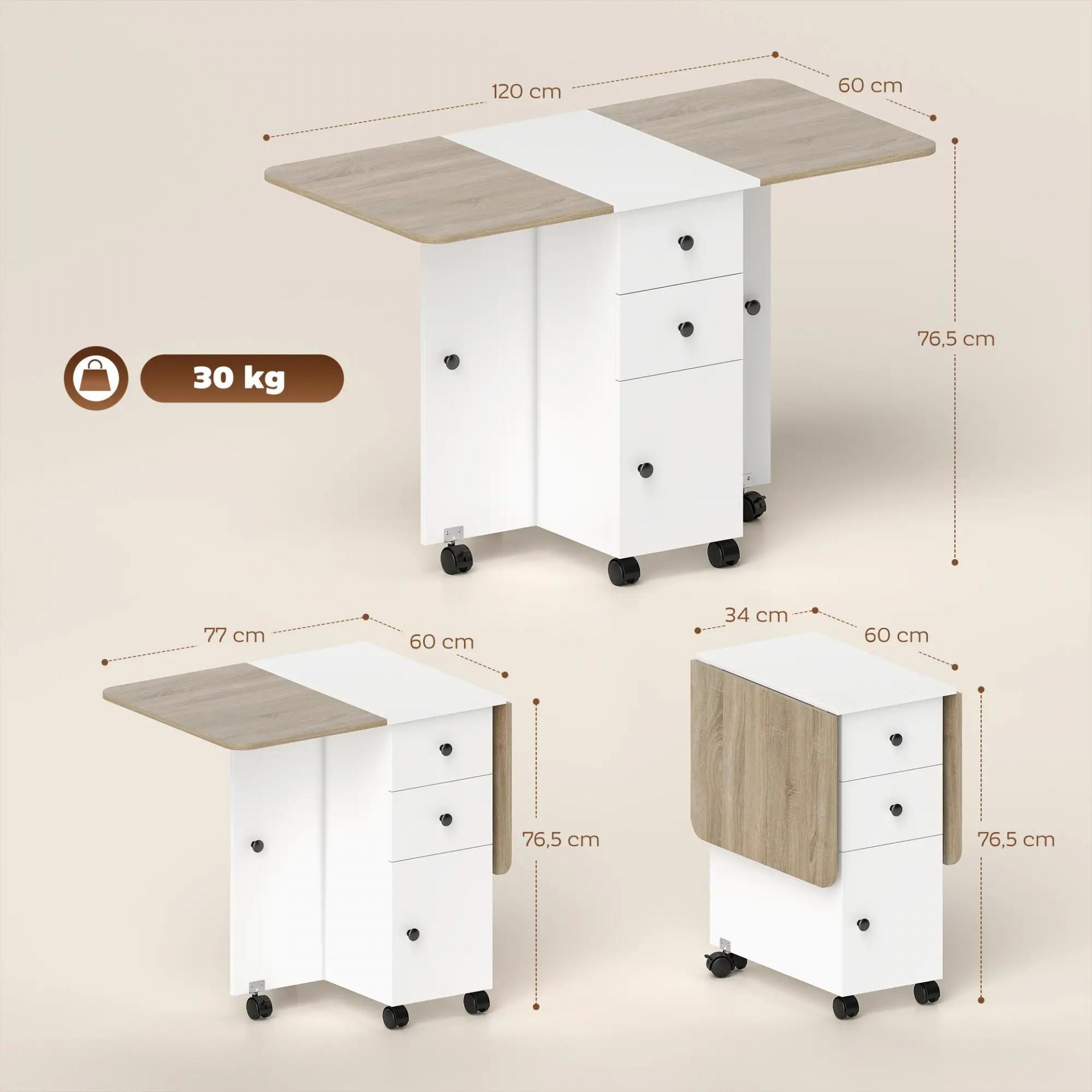 Mesa Plegable de Comedor con Ruedas Alas Abatibles 2 Cajones y Armario Hasta 6 Personas 120x60x76,5 cm Blanco y Natural