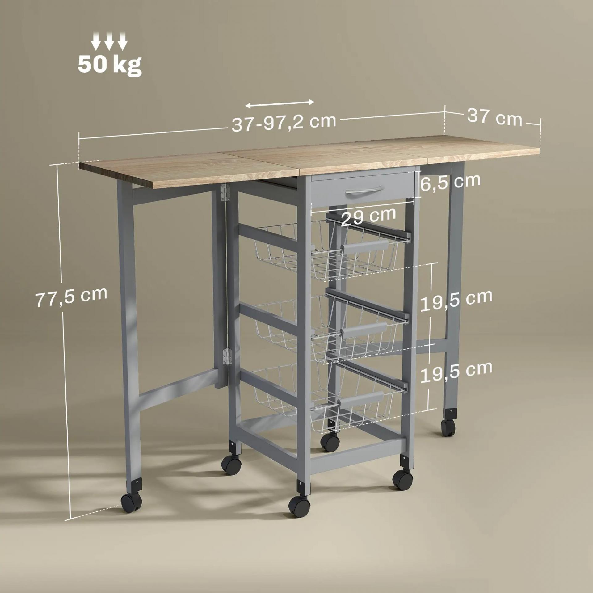 - COMPACTO Y PLEGABLE: Este carrito de cocina de HOMCOM es ideal para espacios reducidos. Sus dos alas plegables ofrecen superficie extra al cocinar y se pliegan fácilmente al terminar, optimizando el espacio y manteniendo la cocina siempre ordenada
