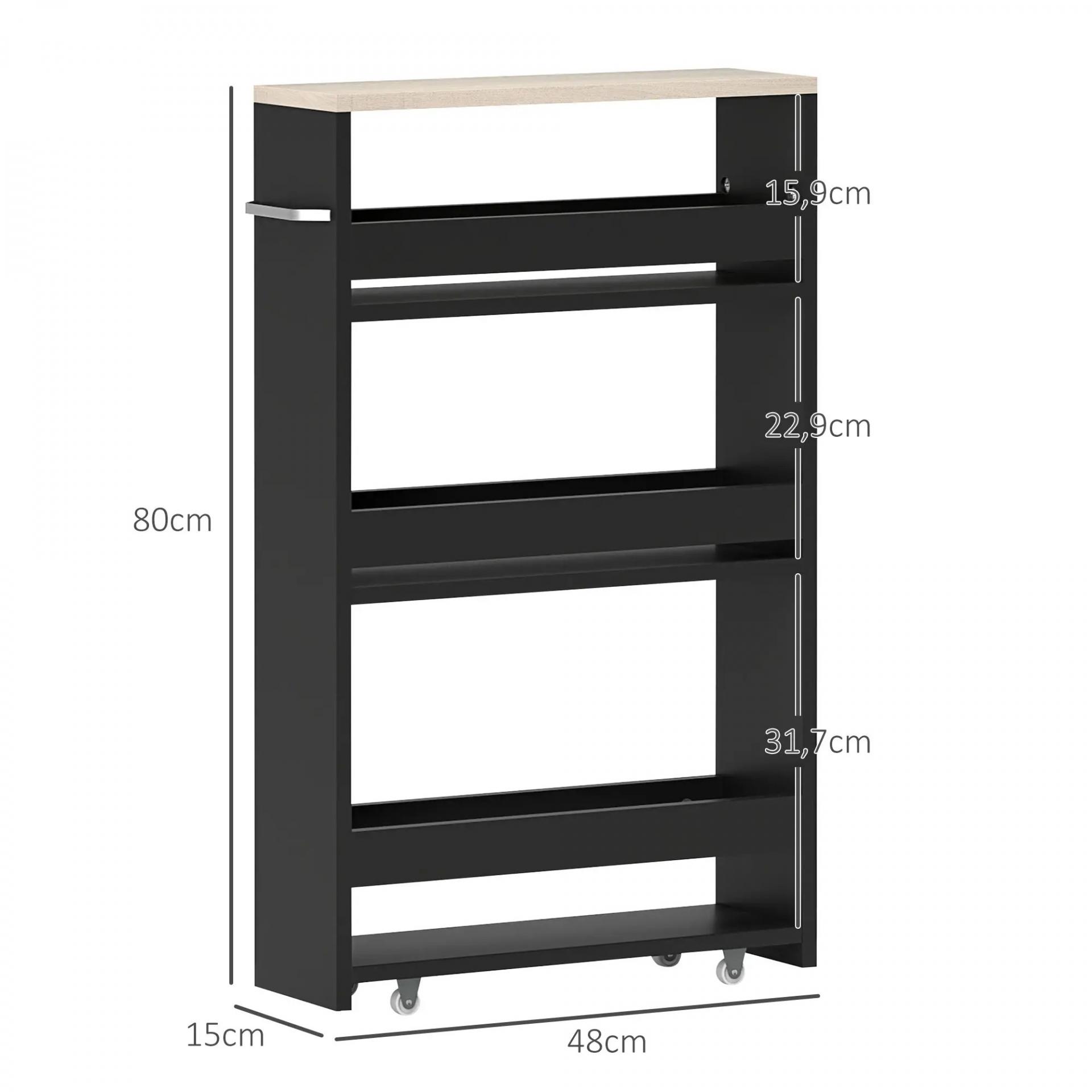 Carrito Auxiliar con Ruedas de 3 Niveles Carrito de Cocina Estrecho con 3 Estantes Tablero y Asa 48x15x80 cm Negro