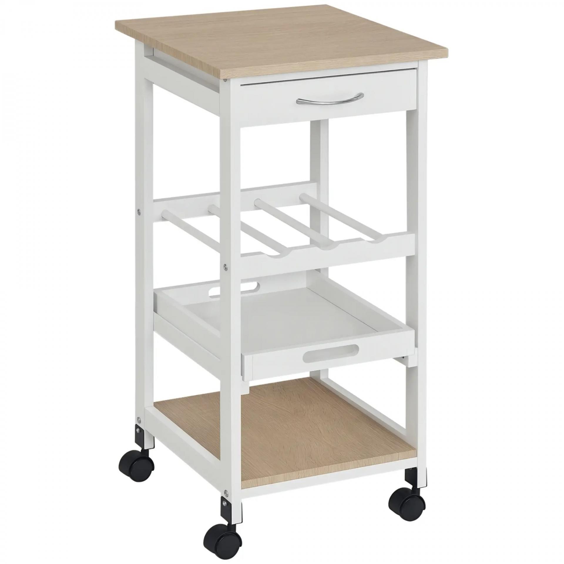 Carrito de Cocina Carro de Servicio Multifuncional de 4 Niveles con Ruedas Cajón Estantes y Botellero 37x37x76 cm Blanco