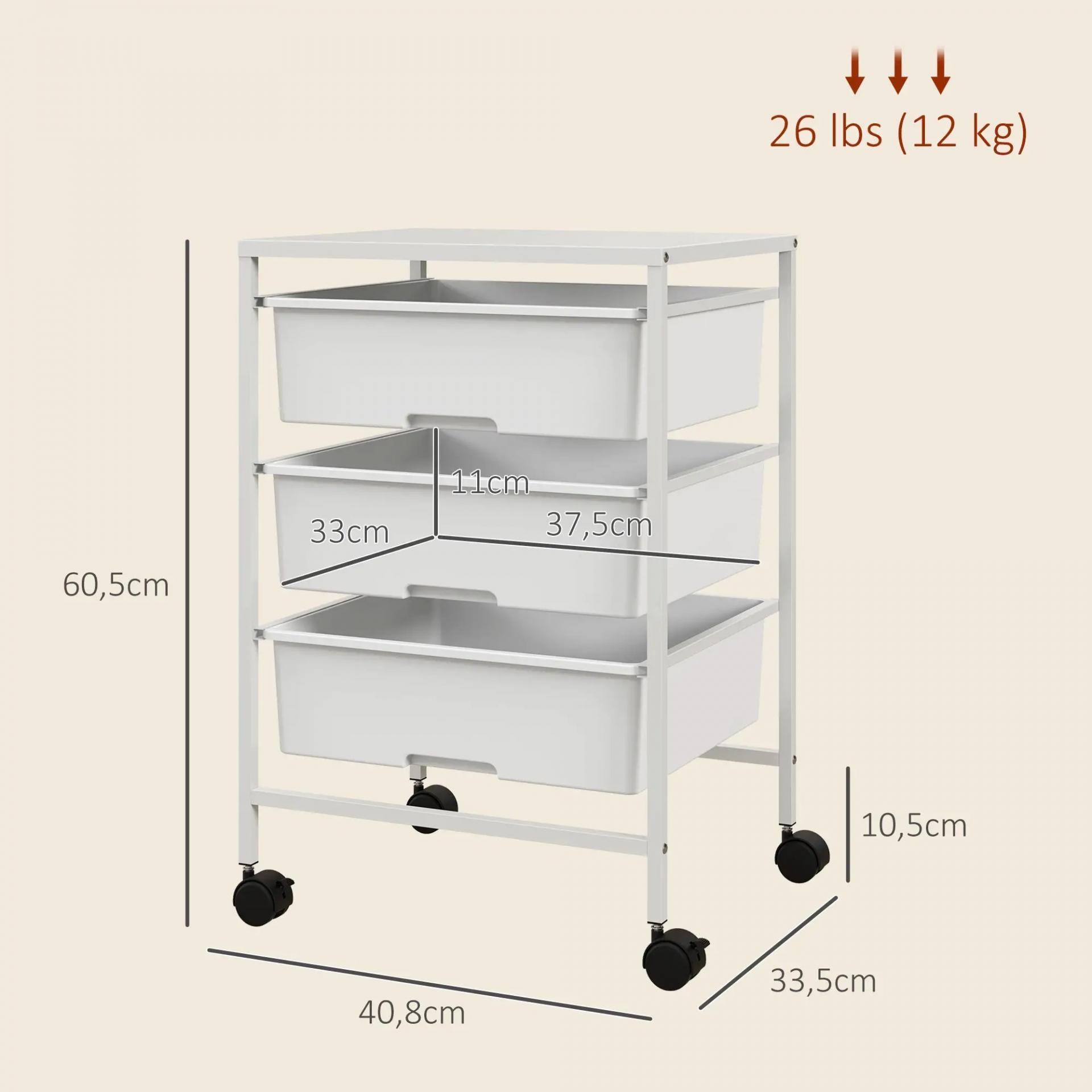 Carrito Auxiliar con Ruedas con 3 Cestas para Almacenamiento y Marco de Acero para Cocina Baño 40,8x33,5x60,5 cm Blanco