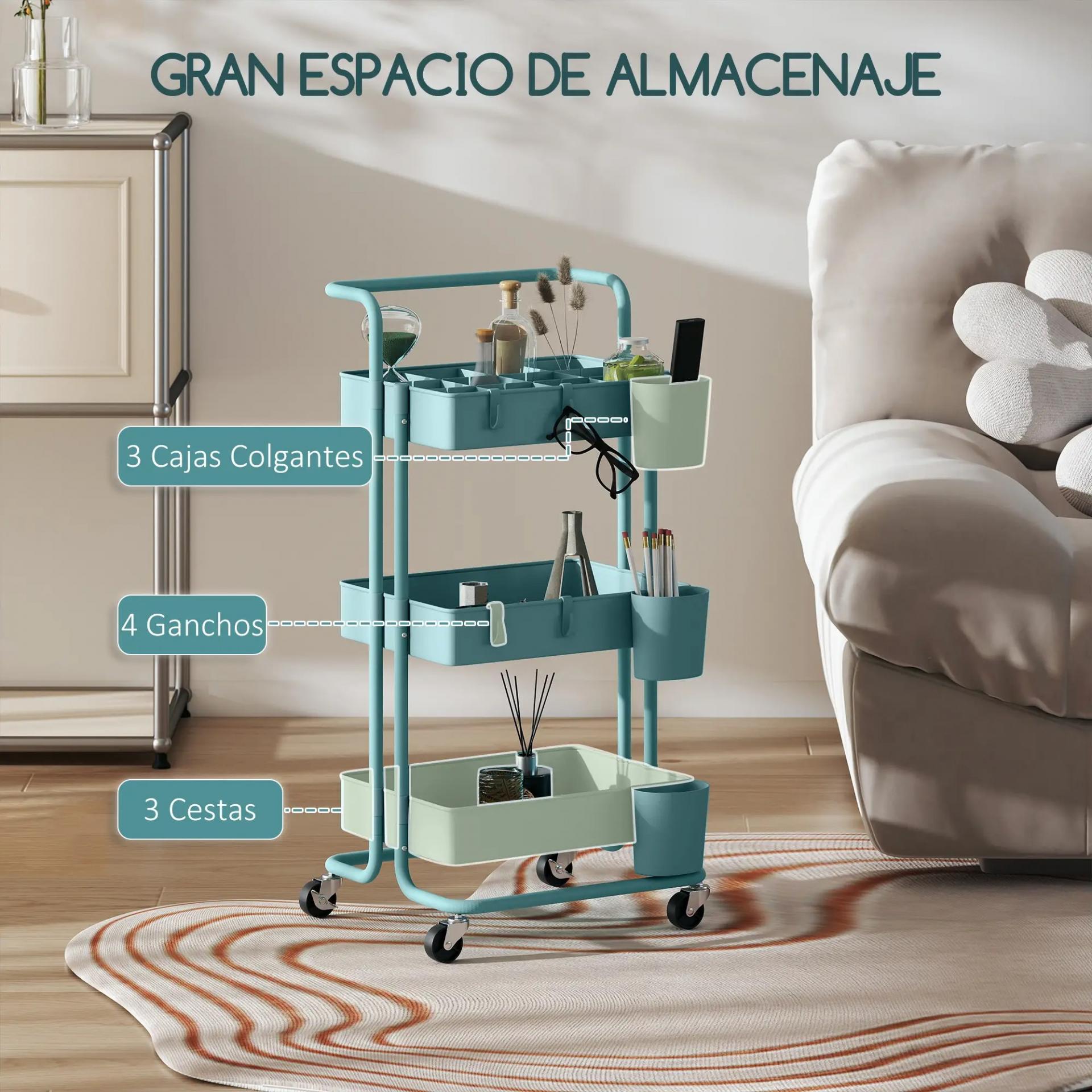 Carrito Auxiliar con Ruedas Carro de Almacenaje Multifuncional con Ganchos y Cajas Colgantes 42x38x86,5 cm Azul Verdoso