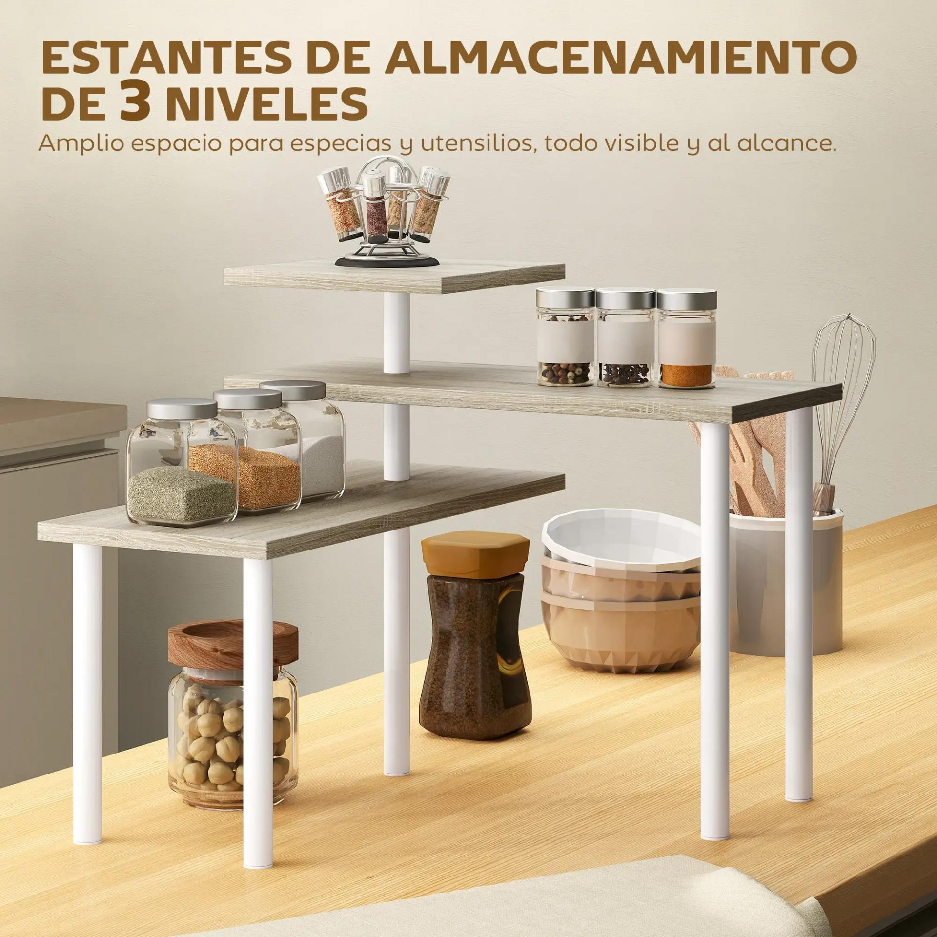 ESTANTERÍAS DE ALMACENAMIENTO DE 3 NIVELES: Descubre esta estantería de cocina con diseño escalonado de tres niveles, perfecta para mantener especias, utensilios y otros objetos organizados y siempre al alcance de la mano