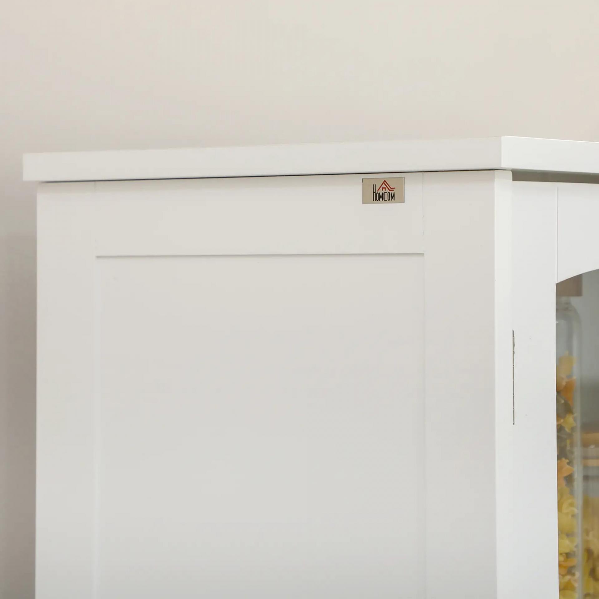 ¿NO TIENES SUFICIENTES ARMARIOS? NO HAY PROBLEMA: No te sientas abrumado por la falta de espacio de almacenamiento. Este mueble auxiliar de cocina de HOMCOM con puertas proporcionará todo el espacio de almacenamiento extra que necesitas para ese nuevo conjunto de ollas y sartenes que tienes en la mira, platos y otros objetos. Gracias a su diseño moderno y color blanco, este mueble se combinará fácilmente con la decoración de tu casa