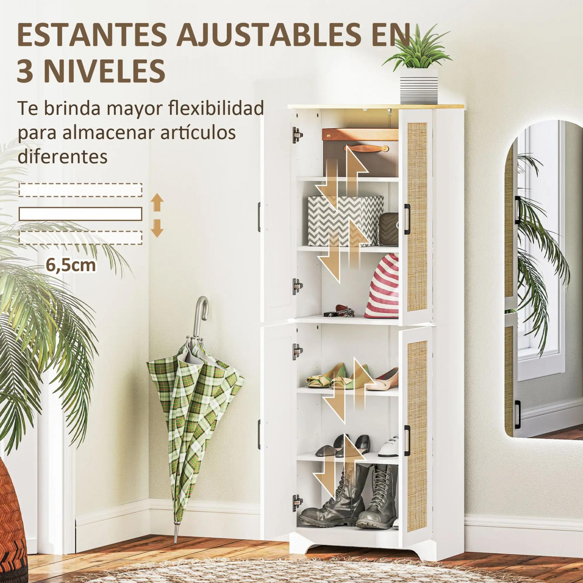 - ALACENA ELEGANTE: Con sus puertas de ratán y tiradores de acero, este armario auxiliar añade un toque bohemio y elegante a tu cocina, comedor o pasillo, combinando funcionalidad y decoración en un solo mueble