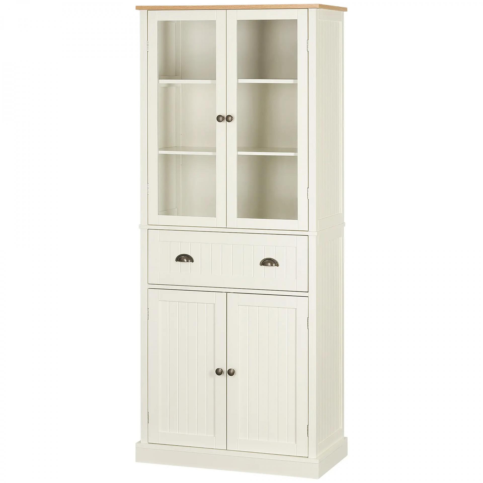 Alacena de Cocina Aparador Alto de Comedor con Vitrina Cajón y Armario con Puertas 76x40x182,5 cm Crema