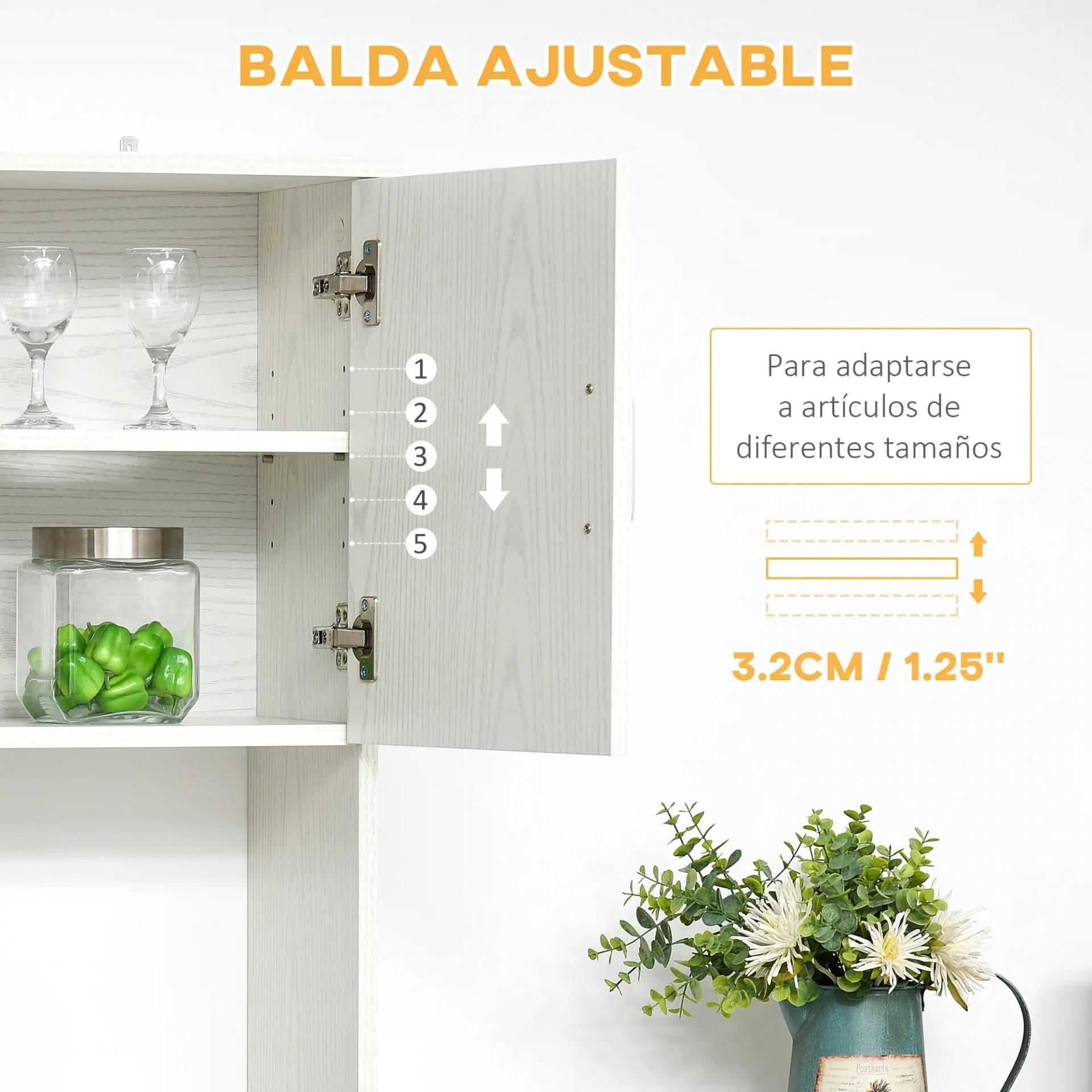 - GRAN ALMACENAJE: Armario blanco de cocina compuesto por 3 módulos de armario con puertas, un compartimiento abierto, un cajón deslizable y una espaciosa encimera donde colocar tu microondas o cafetera. El armario superior tiene una balda interior ajustable en altura para adaptarse a artículos de diferentes tamaños