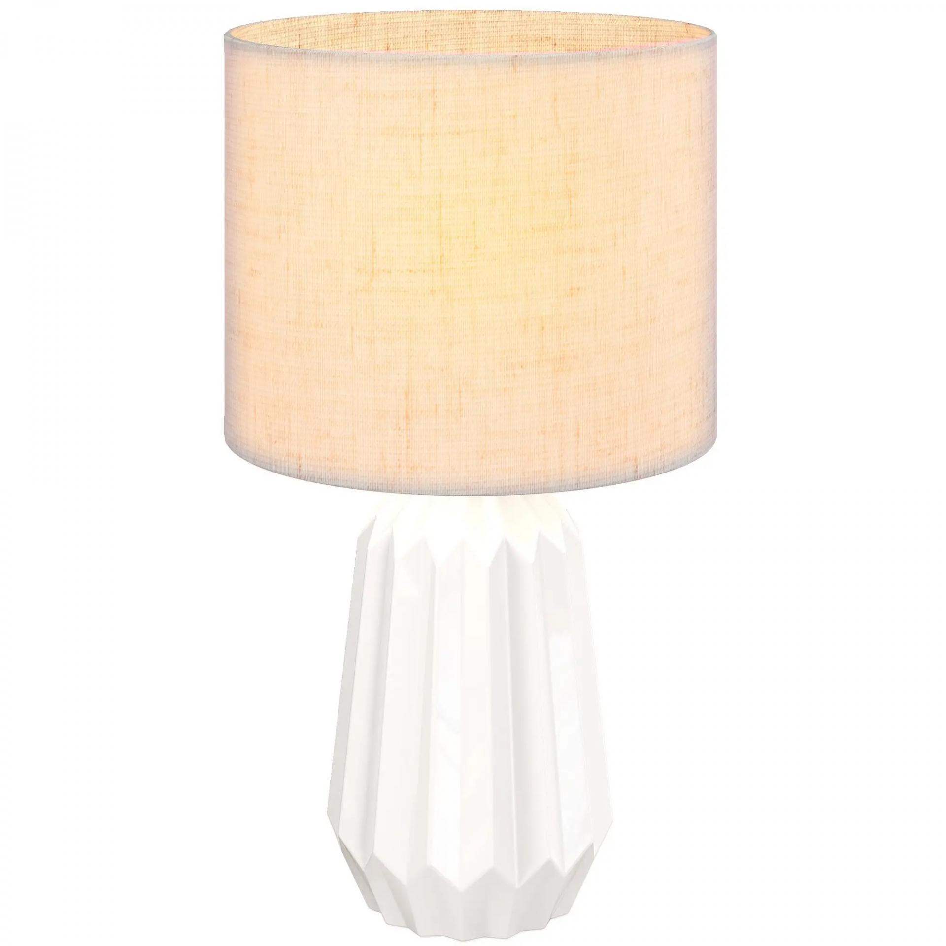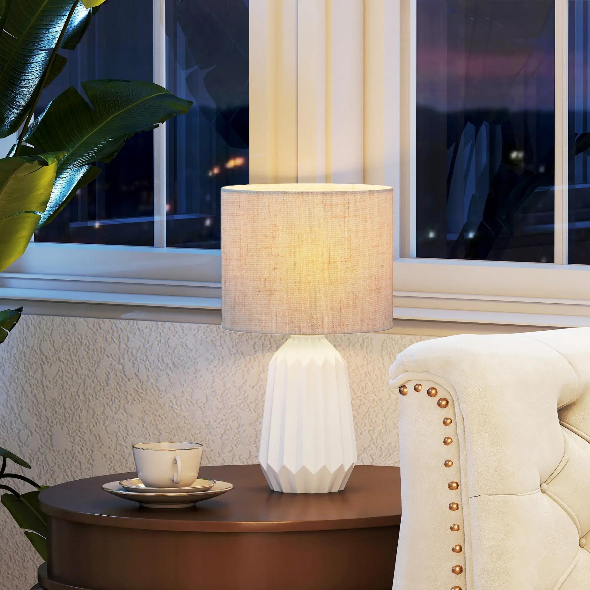 Lámpara de Mesa con Base de Cerámica y Pantalla de Lino Estilo Retro para Dormitorio 40W Blanco y Beige