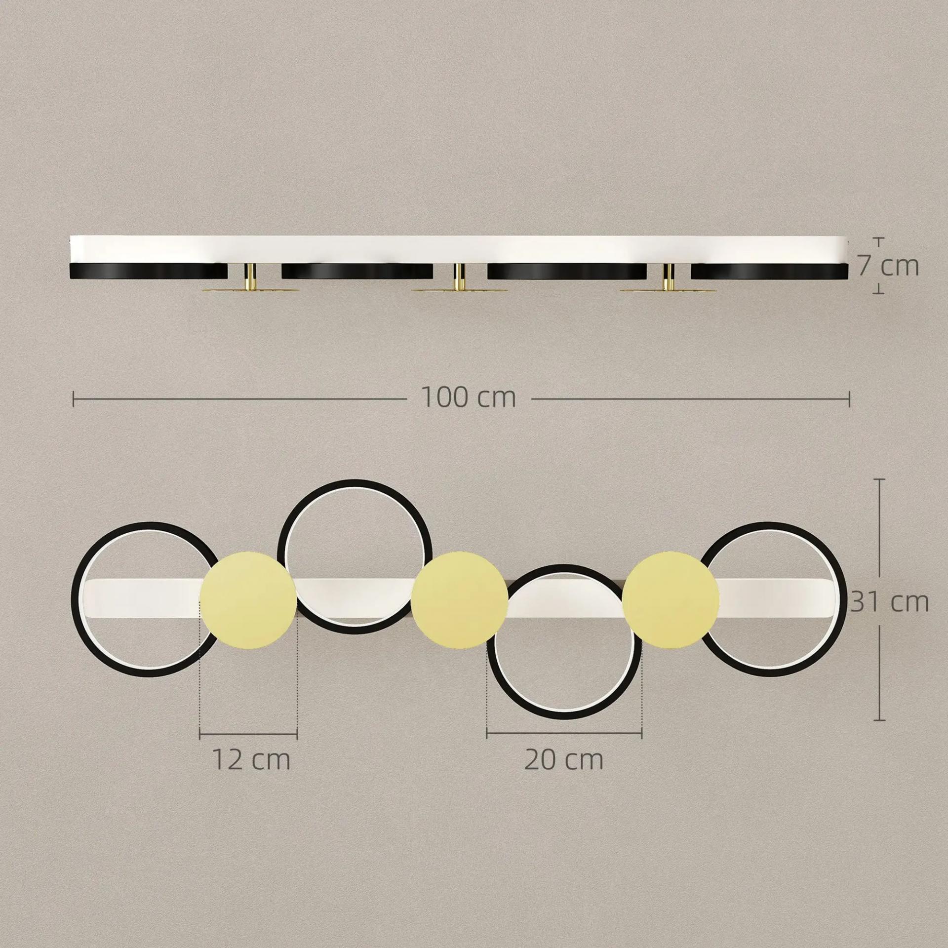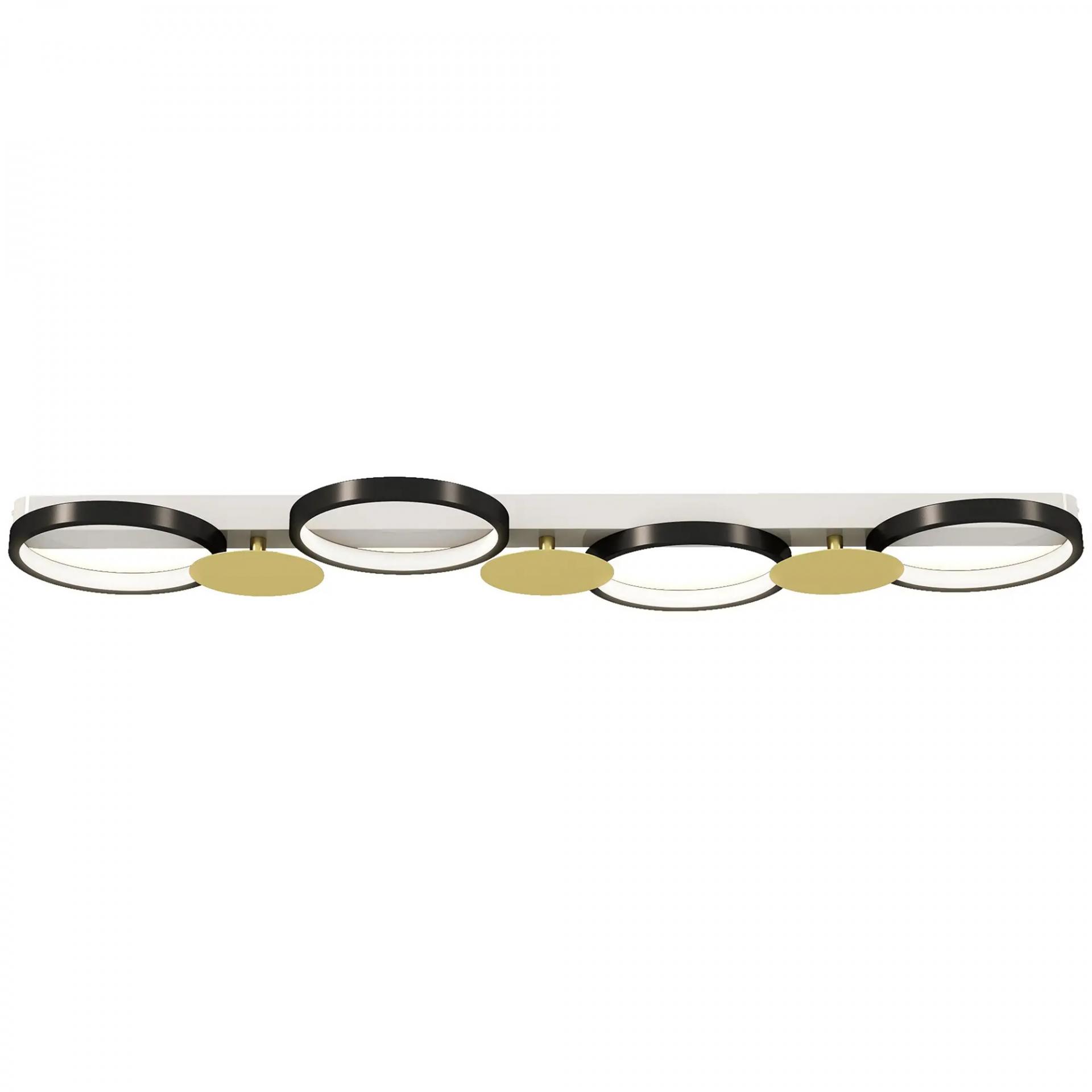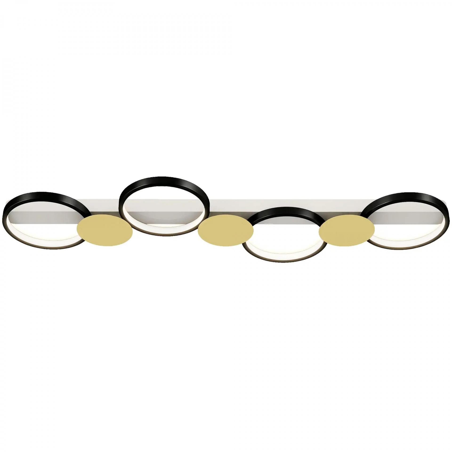 - MEDIDAS TOTALES: 100x31x7 cm (LxANxAL). Base: 100x5x3,5 cm (LxPxAN). Anillos de luz: Ø20 cm (4 unidades). Discos dorados: Ø12,5 cm (3 unidades). Potencia: 38 W. Flujo: 1500 lm. Temperatura: 3000K-6500K