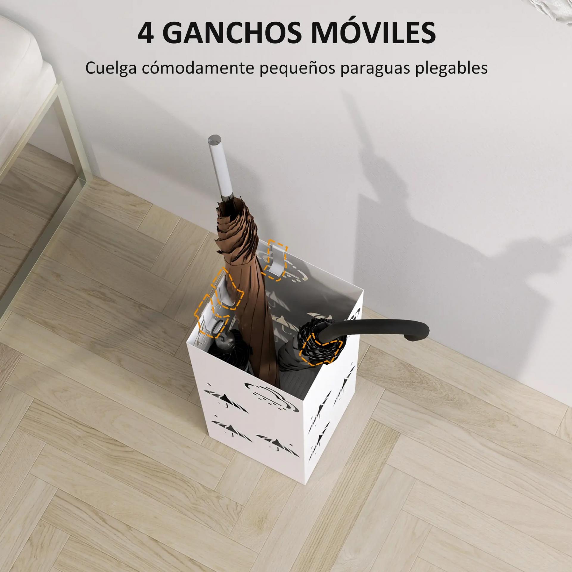 - AMPLIO ESPACIO: Este práctico paragüero, con medidas de 15,5x15,5x41 cm (LxANxAL), ofrece espacio suficiente para paraguas de tamaño normal. Además, incluye cuatro ganchos ajustables para colgar paraguas pequeños y plegables