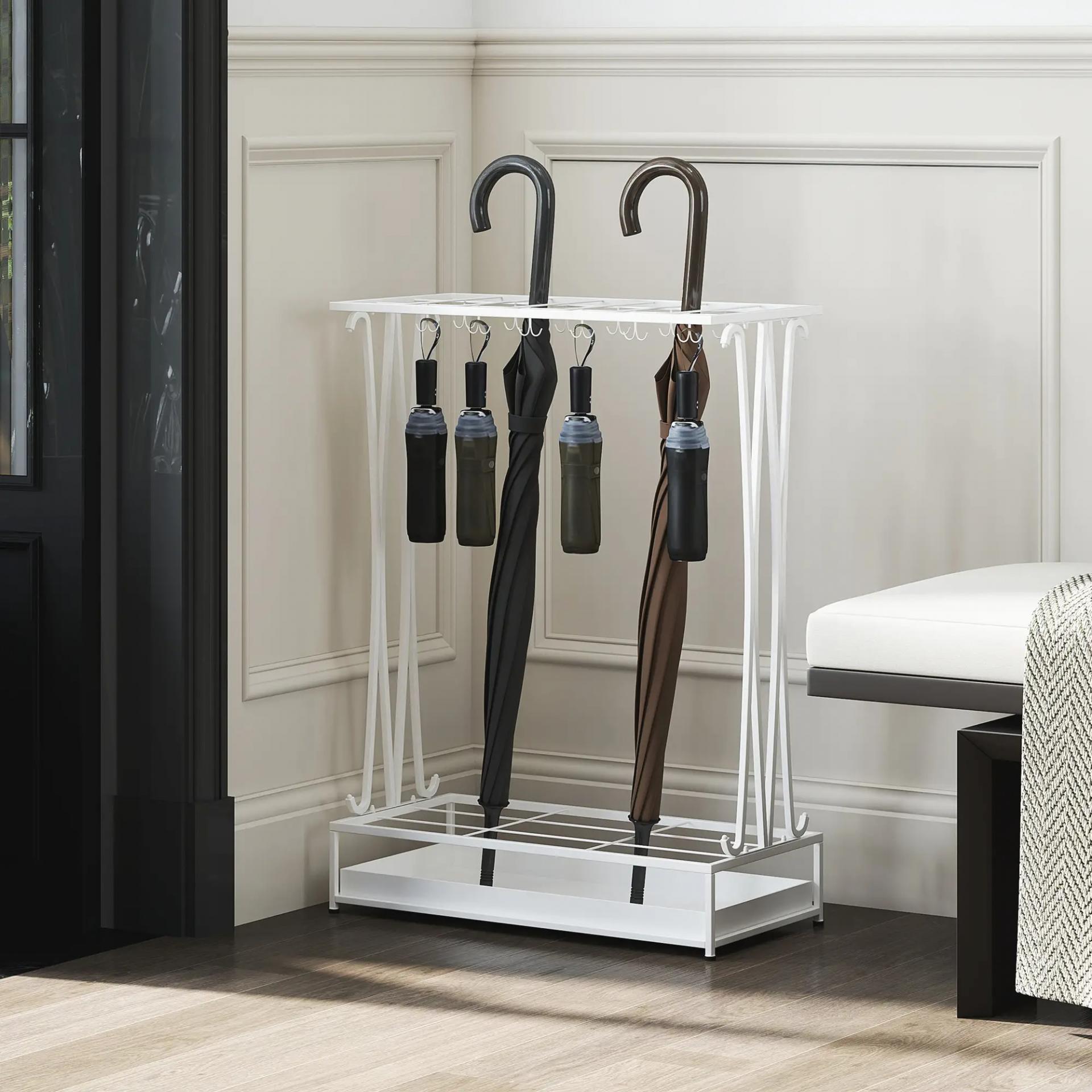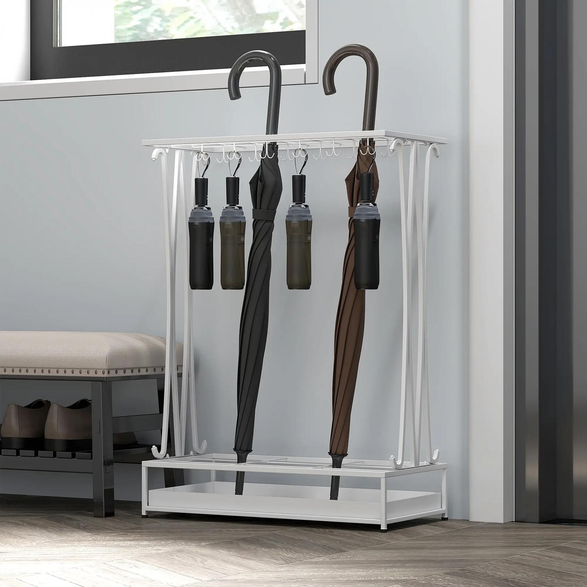 Paragüero Moderno de Acero con 21 Espacios y 24 Ganchos Bandeja Recogegotas Extraíble para Entrada 50x24x68 cm Blanco