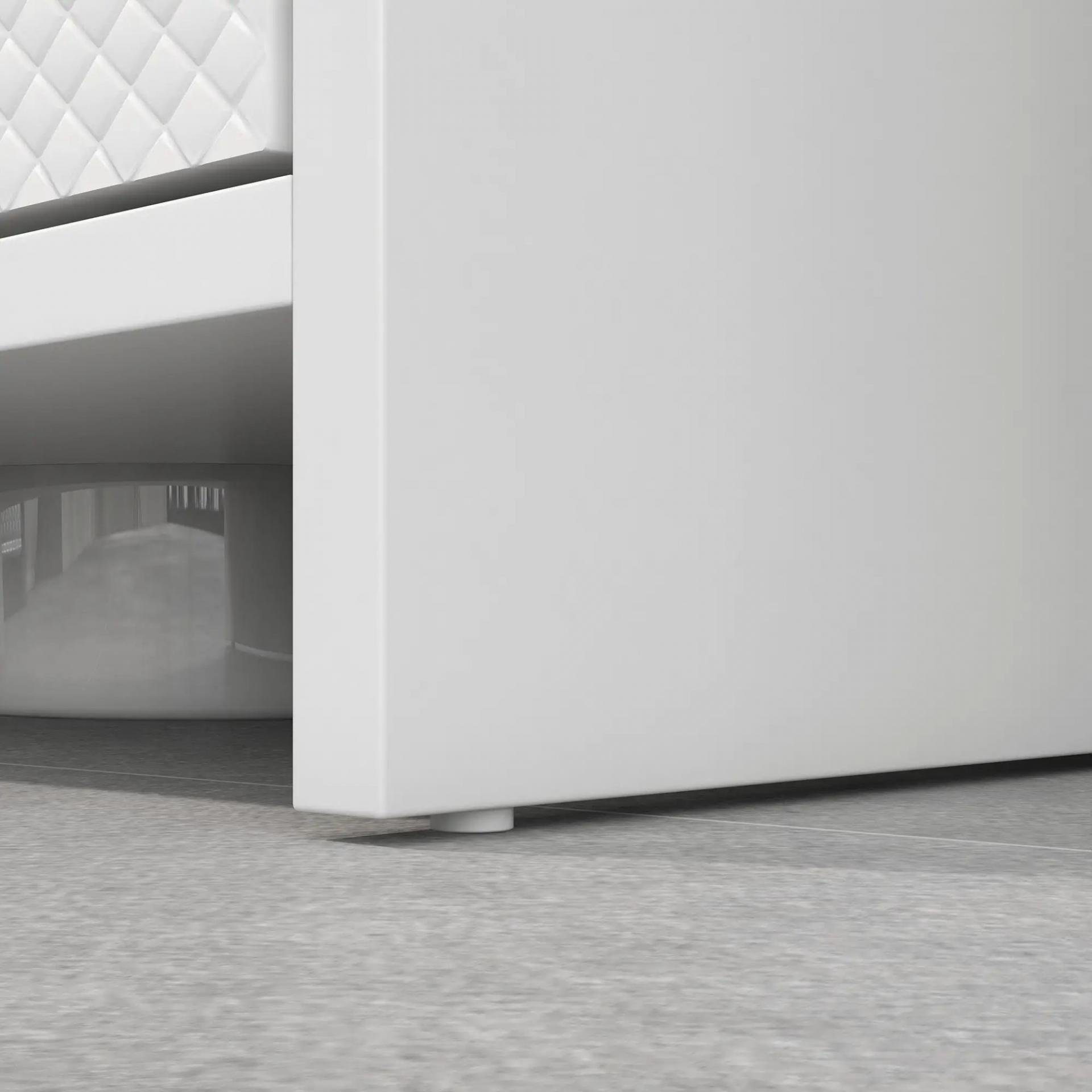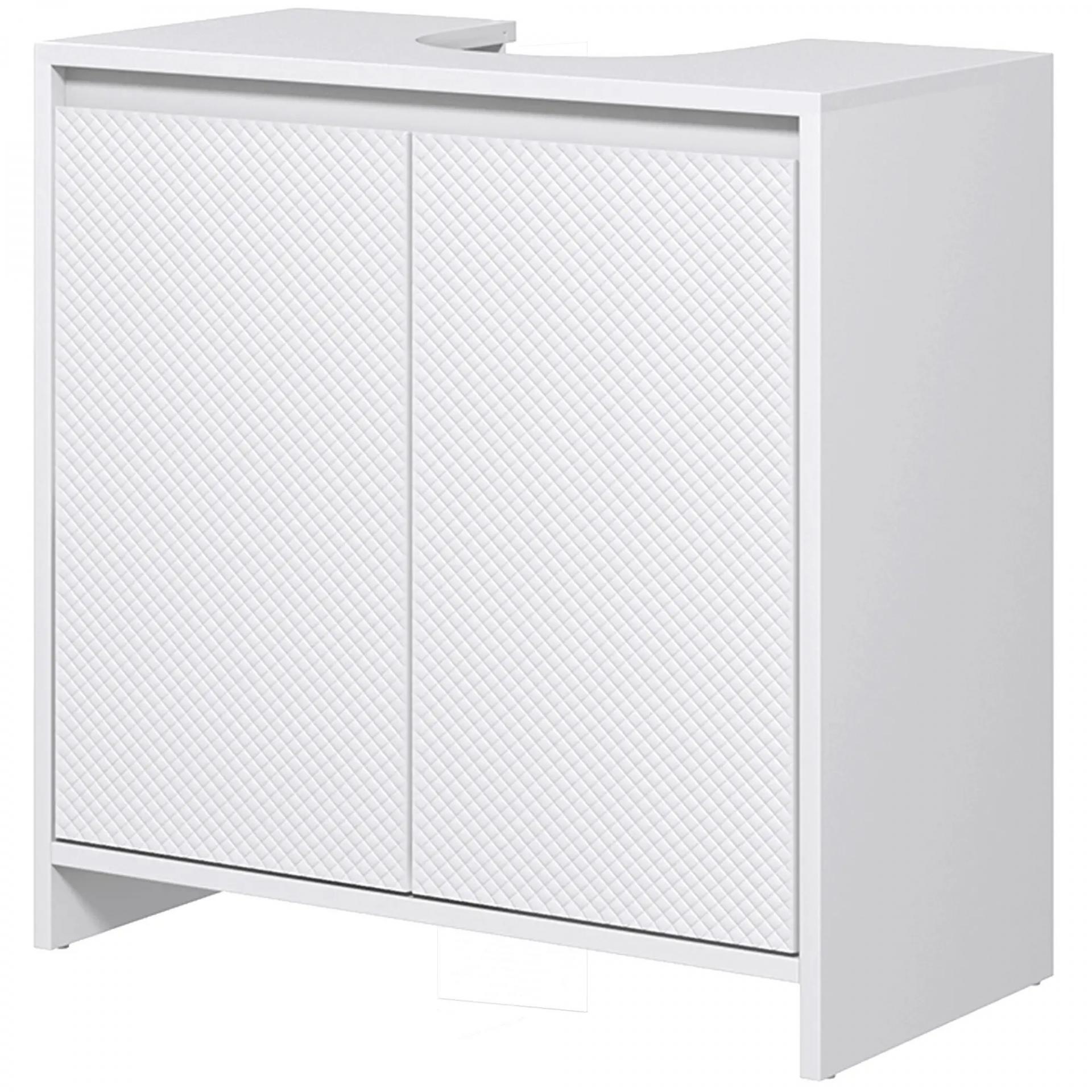 - ESTILO MODERNO: Este mueble bajo lavabo con acabado blanco y paneles de puertas adornados con pequeños patrones en forma de diamante ofrece una textura única que complementa diversos estilos de baño. El diseño inclinado de los paneles superiores crea una apariencia sin tiradores, facilitando la apertura con los dedos