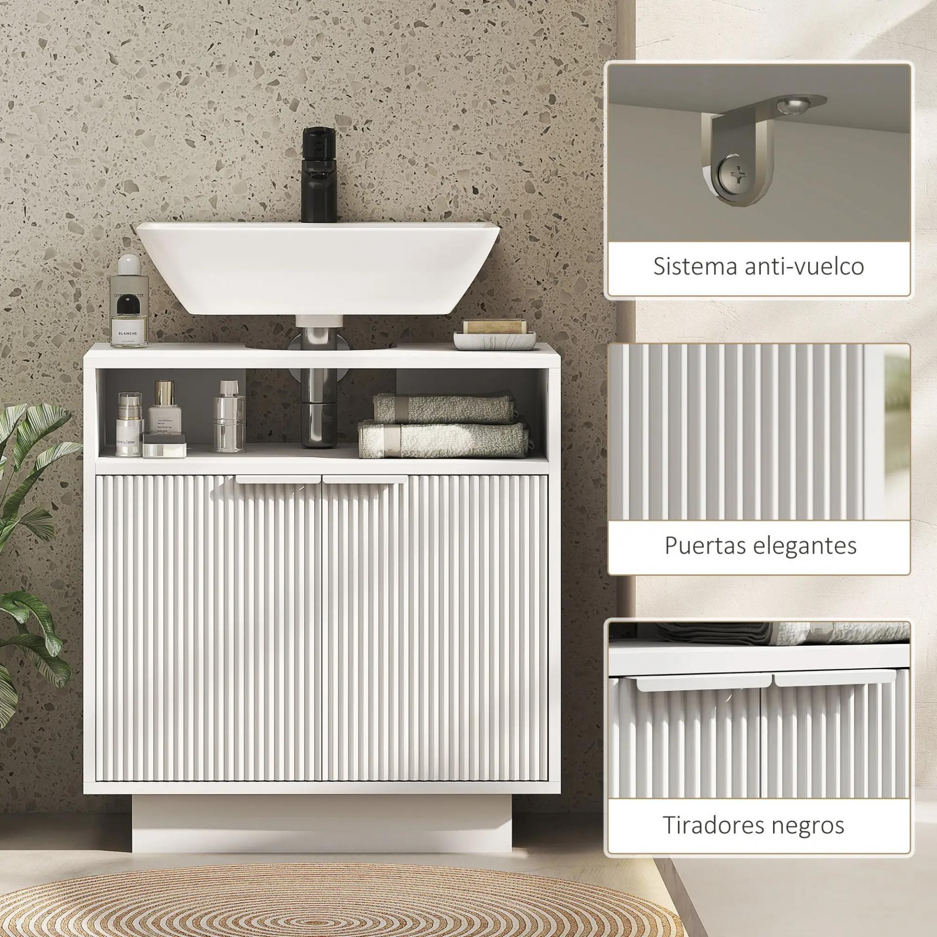 - DISEÑO QUE ENCAJA EN TU BAÑO: Con su acabado blanco, puertas acanaladas y tiradores en blanco, este mueble de baño combina fácilmente con distintos estilos, desde los más clásicos hasta los más actuales