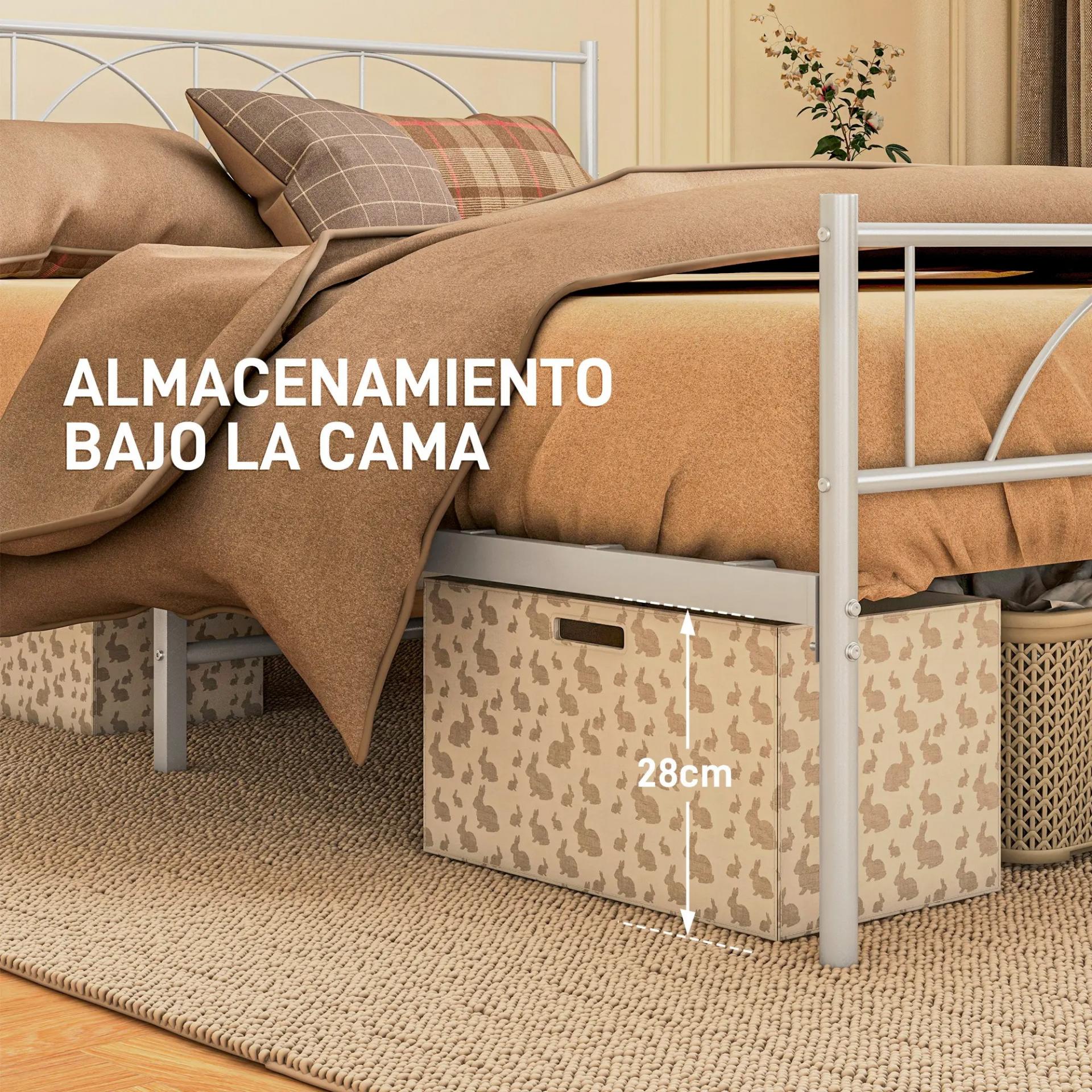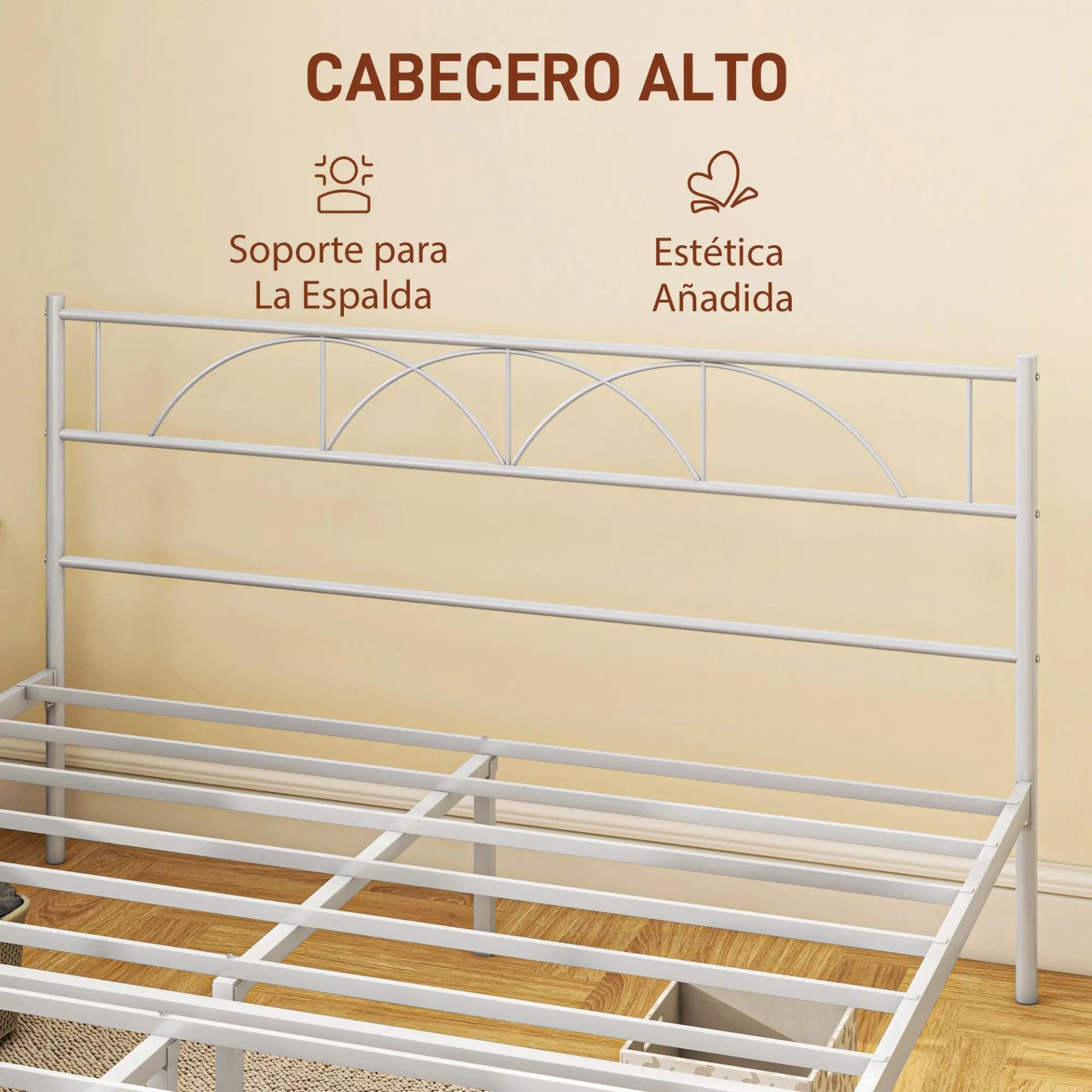 Cama Doble 150x200 cm con Cabecera Listones de Acero y Espacio de Almacenamiento Debajo de la Cama Carga 330 kg Blanco