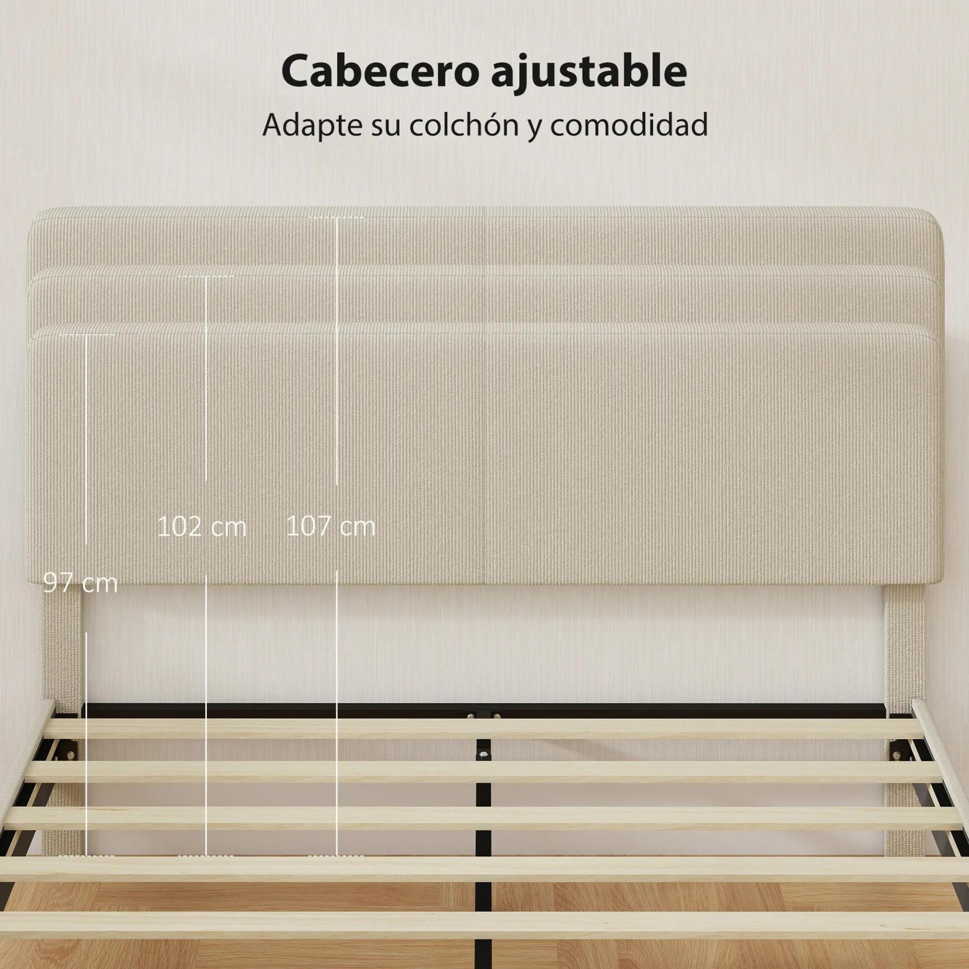 CABECERO AJUSTABLE TAPIZADO: Ajustable a tres alturas (97, 102, 107 cm), el cabecero de esta cama es perfecto para adaptarse a cualquier colchón y nivel de confort. Su acabado en tela de pana suave proporciona una textura cálida y acogedora, ideal para relajarse al final del día