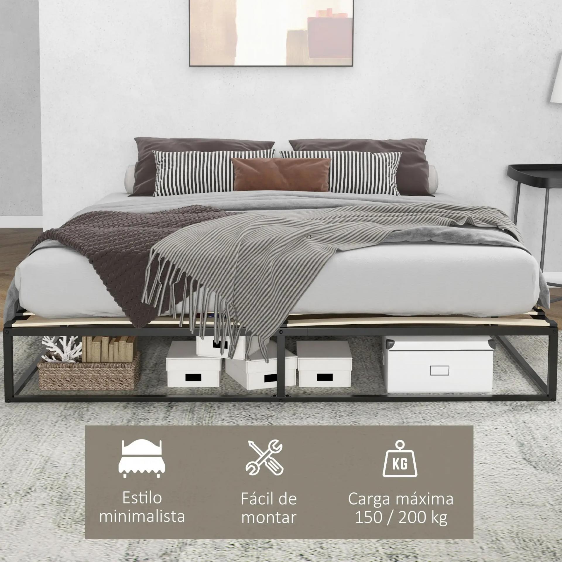 CAMA DOBLE CON ESTILO: Estructura de cama de metal de color negro con somier de lamas de madera natural para habitaciones de matrimonio. Adecuado para colchones de hasta 180x200 cm para que adolescentes, adultos y parejas puedan descansar y dormir cómodamente