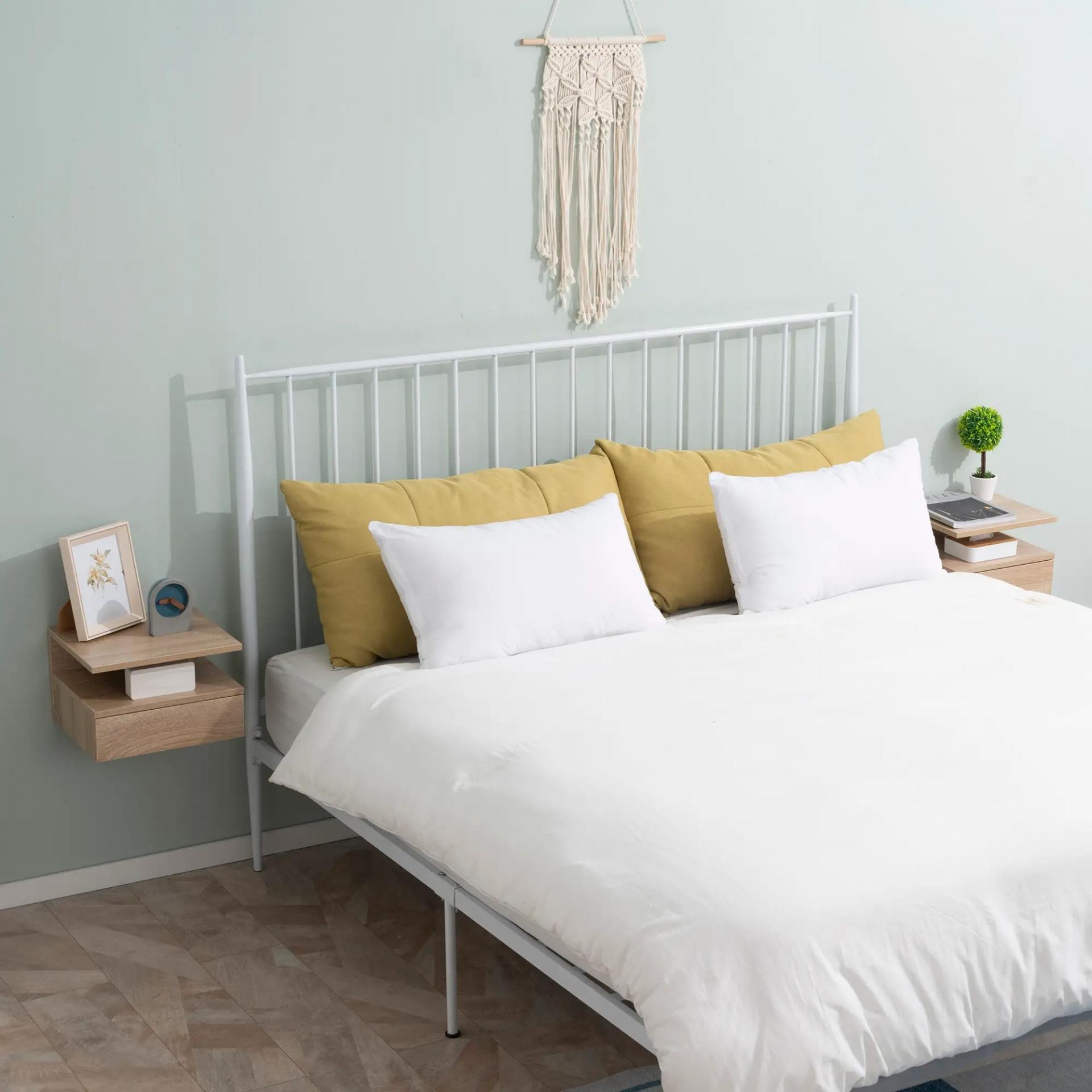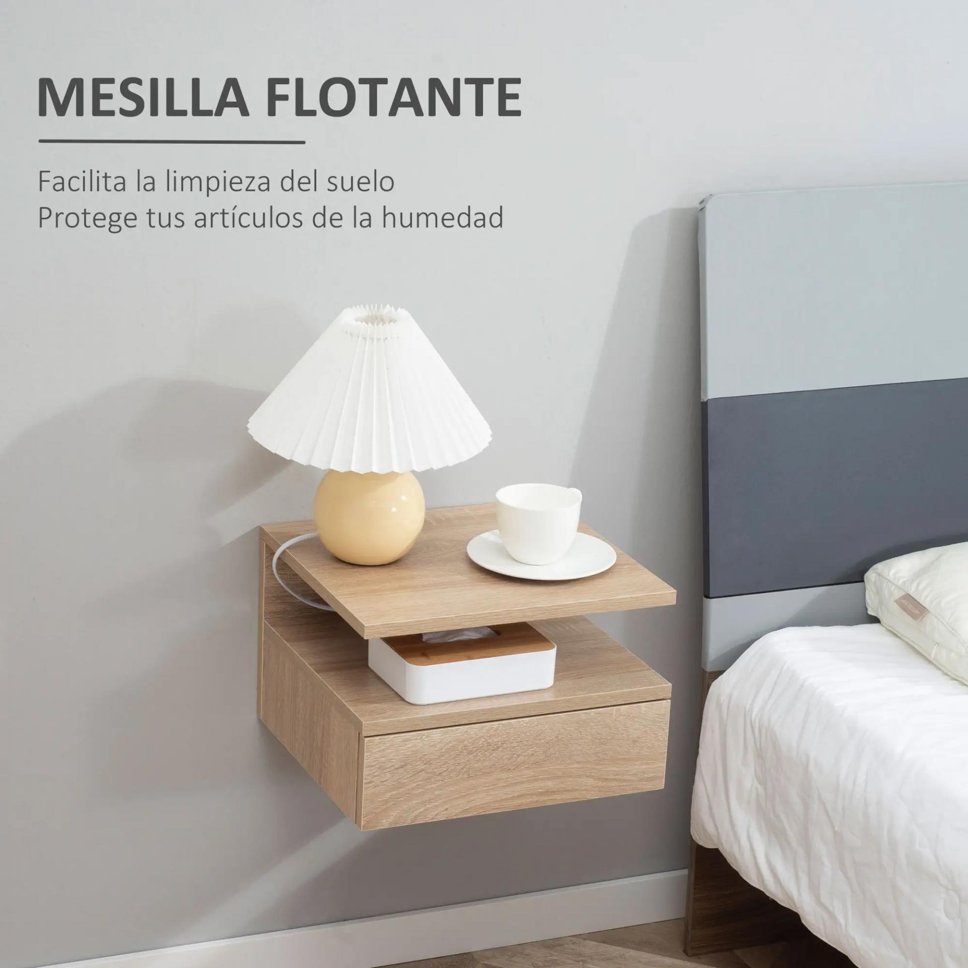 - COLGADAS EN LA PARED: Al ser mesitas de noche flotantes, puedes instalarlas a la altura que prefieras. Su diseño flotante permite una limpieza más fácil del suelo y protege tus objetos de la humedad