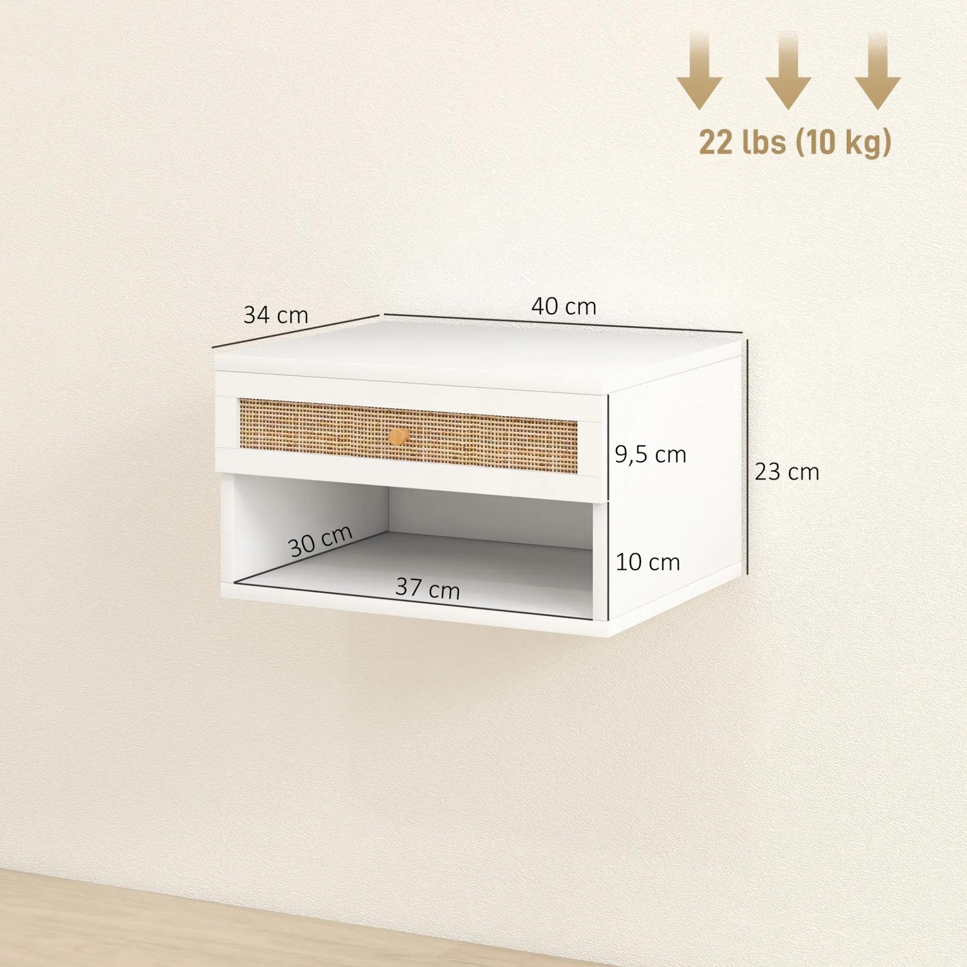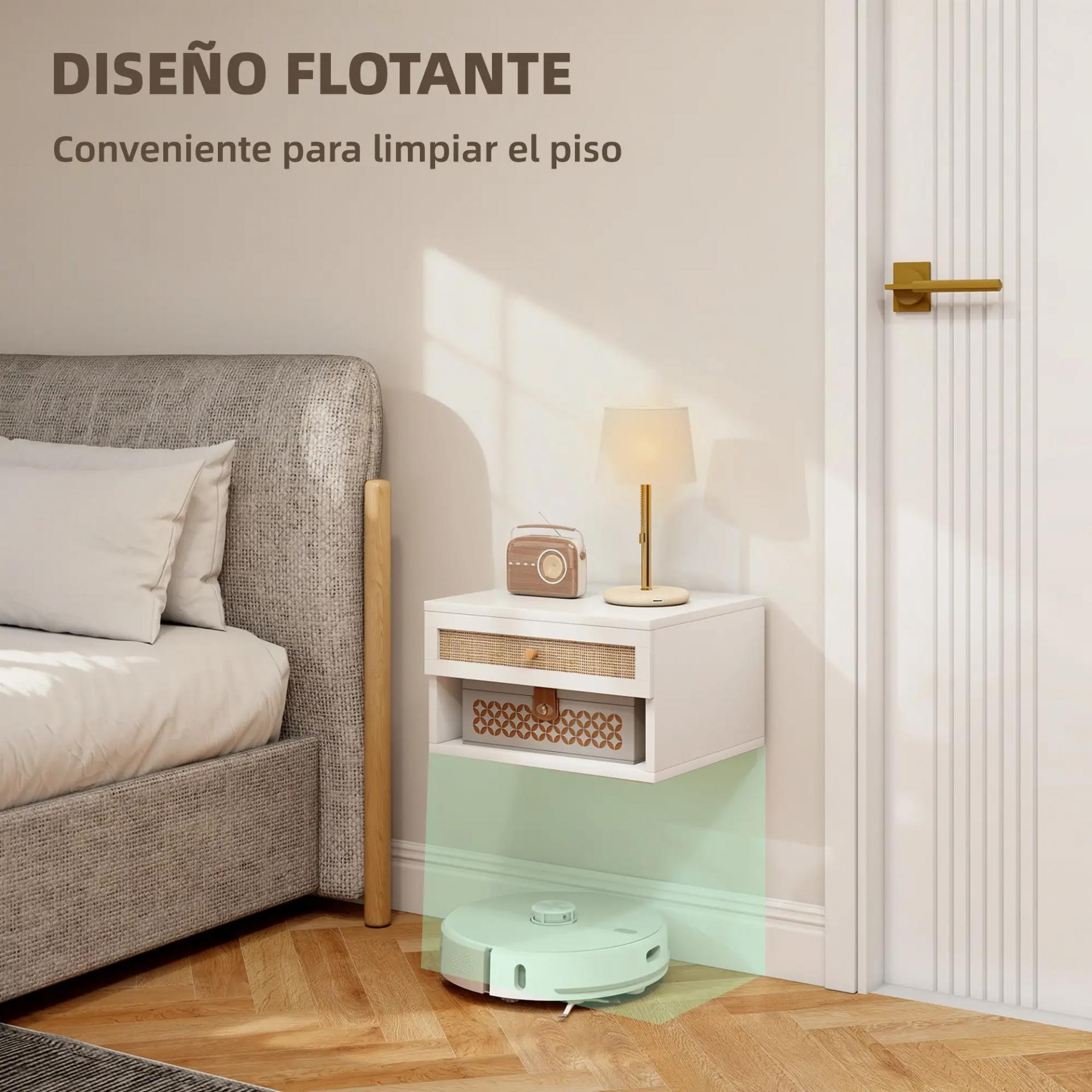 Juego de Mesitas de Noche Flotantes con Cajón de Ratán y Estante Abierto para Dormitorio 40x34x23cm Blanco