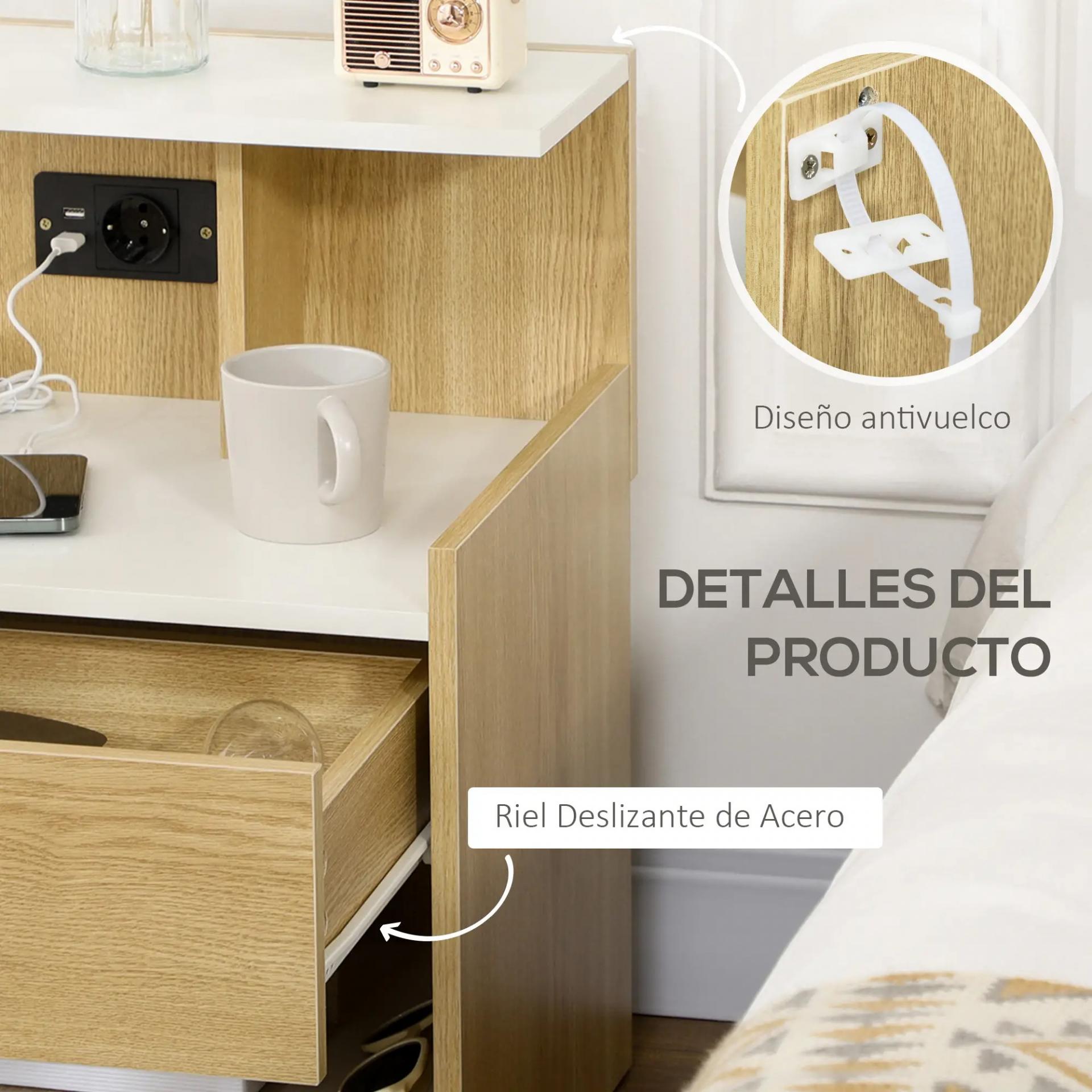 Mesilla de Noche con Puertos USB Toma de Corriente Cajón y Estantes Mesa de Noche 40x40x60 cm Natural