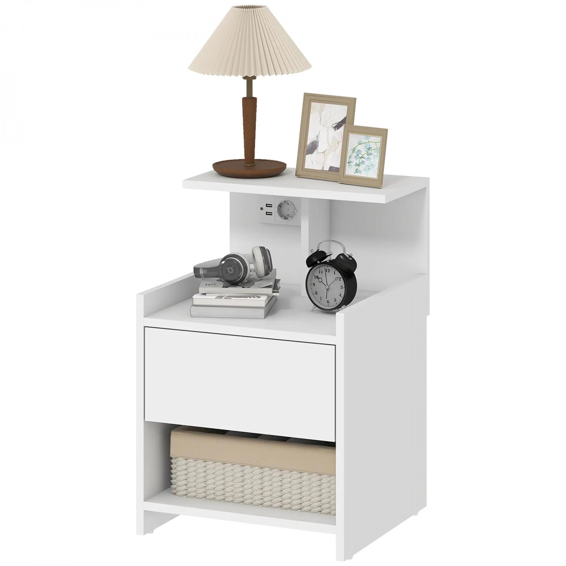 Mesita de Noche con Estación de Carga Puertos USB Cajón y Estantes Mesilla de Noche Dormitorio 40x40x60 cm Blanco
