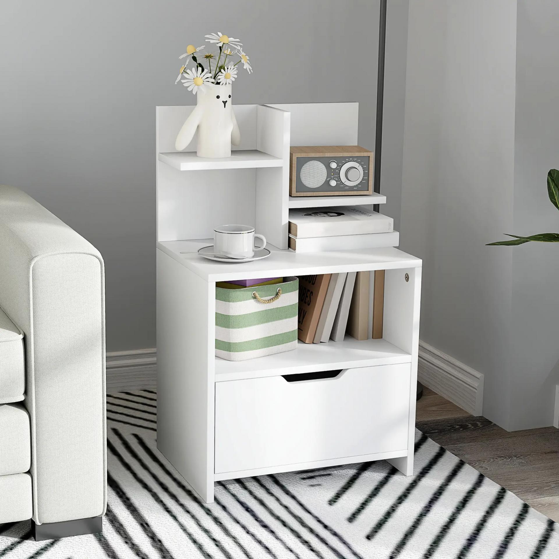 - AMPLIO ESPACIO: Con esta mesilla de noche tendrás todo a tu alcance sin levantarte de la cama. Dispone de un cajón para guardar lo que quieras fuera de la vista, una encimera espaciosa, un estante inferior y otros superiores más pequeños para organizar