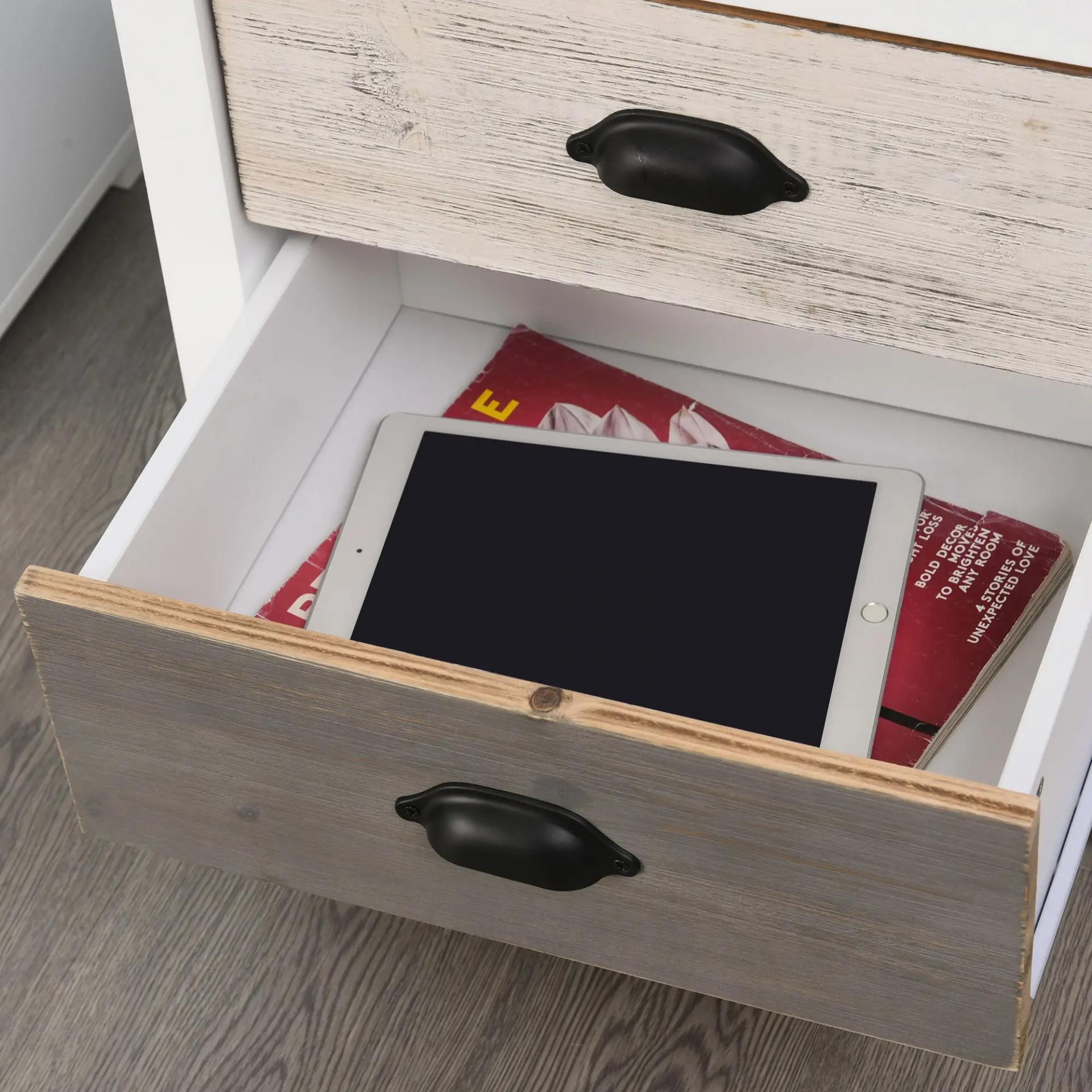 - MEDIDAS TOTALES: 50x38x65 cm (LxANxAL). Interior de los cajones: 34,9x28,7x10,1 cm (LxNAxAL). Peso máximo soportado: 20 kg (encimera), 5 kg (cajón). Se requiere montaje