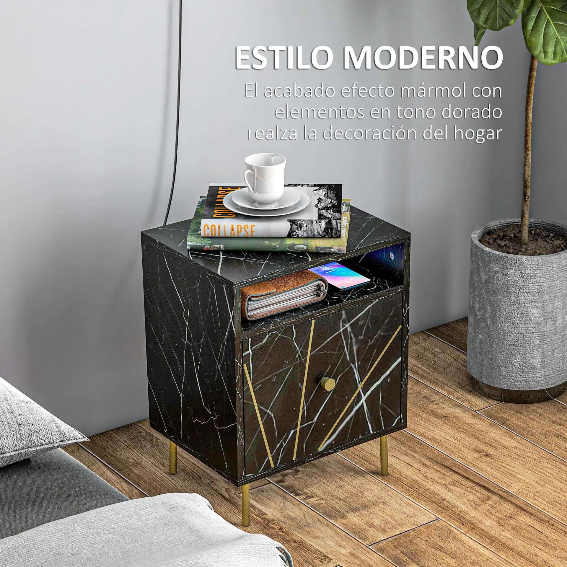 DISEÑO MODERNO Y ELEGANTE: Esta mesita de noche con cajón presenta un acabado de efecto mármol con patas y tirador dorados, aportando un toque de sofisticación ideal para cualquier dormitorio