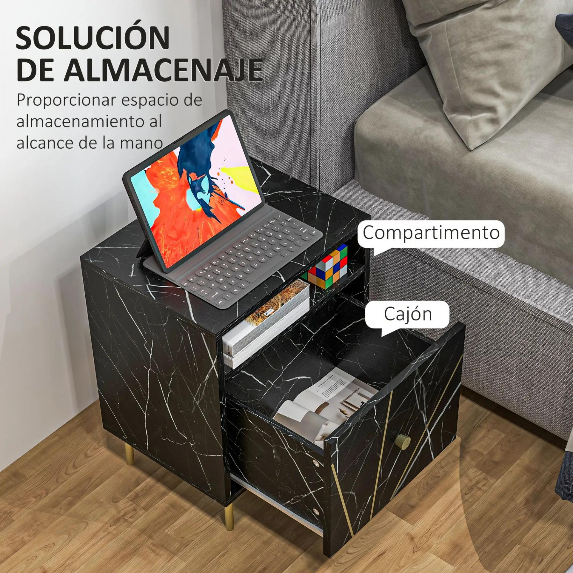 Mesilla de Noche con Efecto Mármol Compartimiento Abierto y Cajón Mesa de Noche para Dormitorio 39x30x50 cm Negro