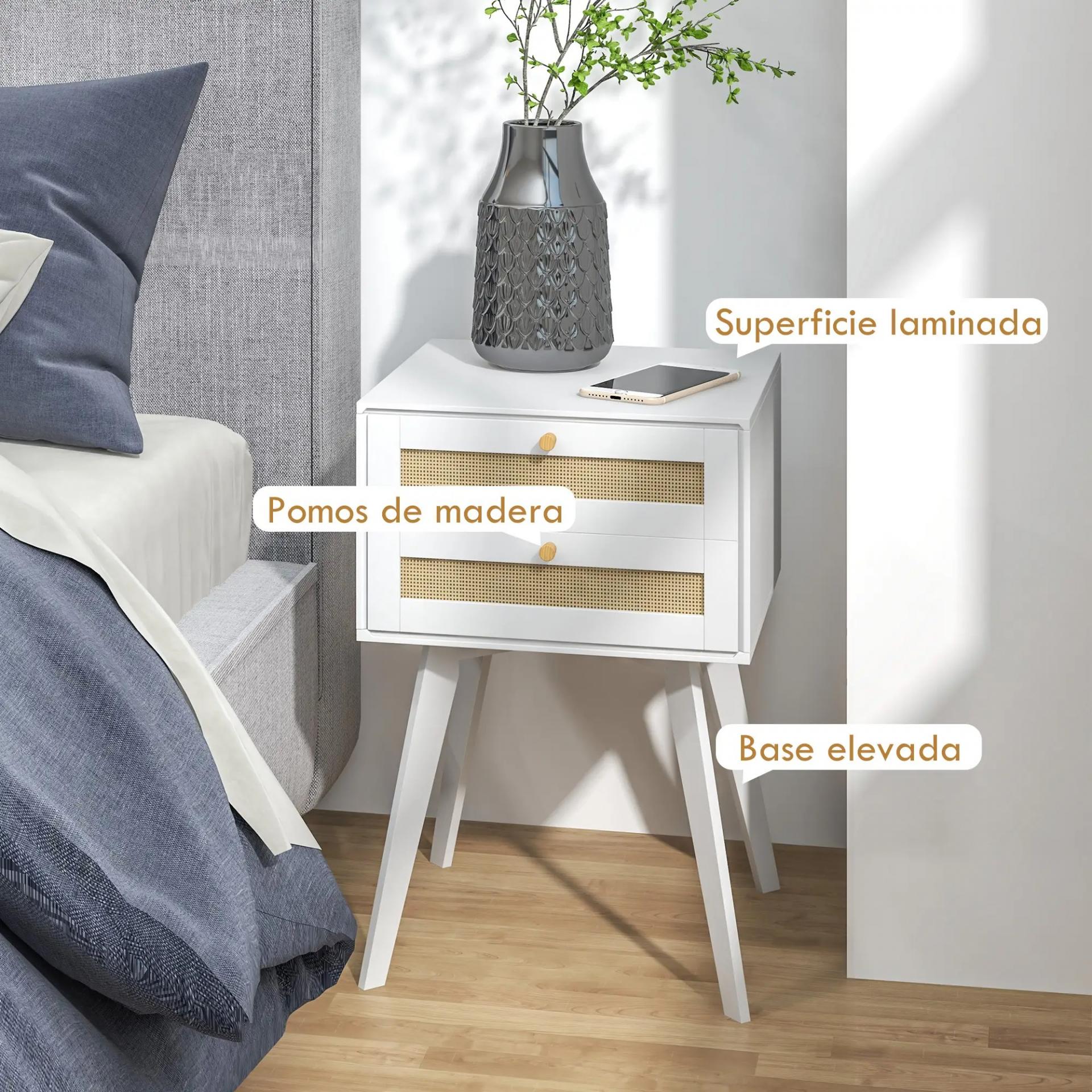 - FRONTAL DE REJILLA DE RATÁN: La mesa de noche presenta dos cajones de ratán y pomos de madera natural. Esta combinación de lo estilo cannage y moderno realza la estética de cualquier habitación. Además, el diseño de ratán es más transpirable, ideal para climas cálidos