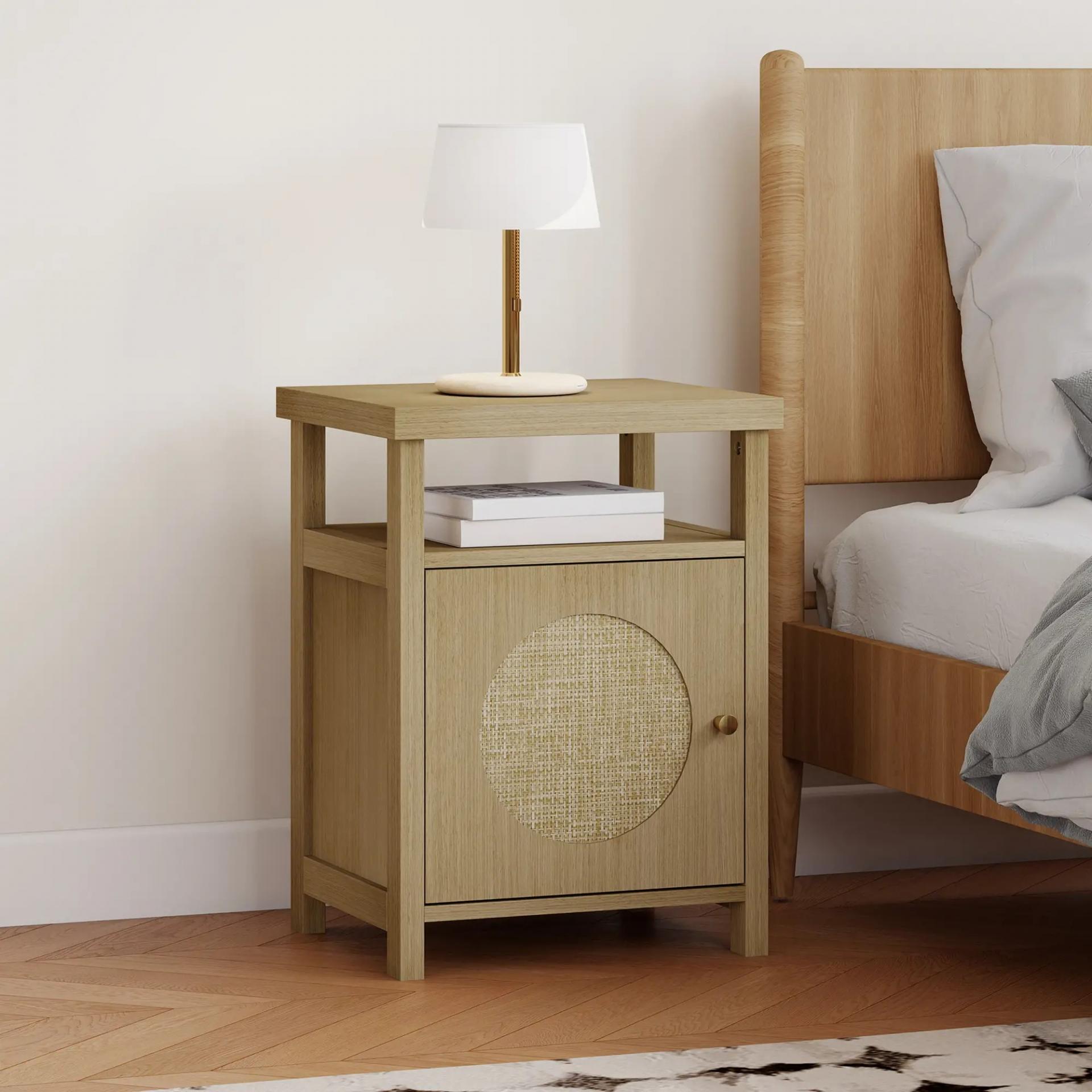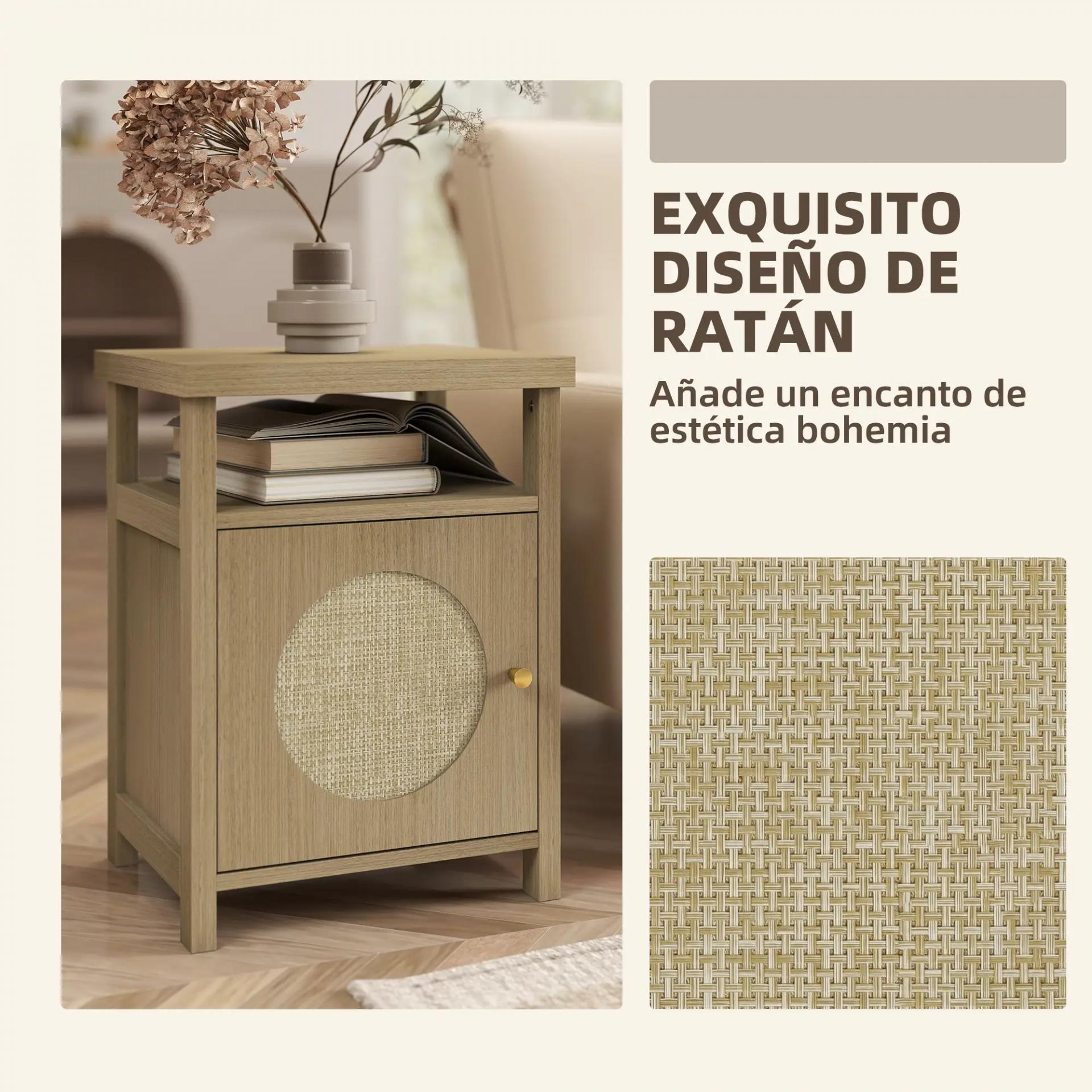 Mesita de Noche con Puerta de Ratán Mesilla de Noche con Estante Abierto y Compartimento 40x35x55 cm Madera Natural