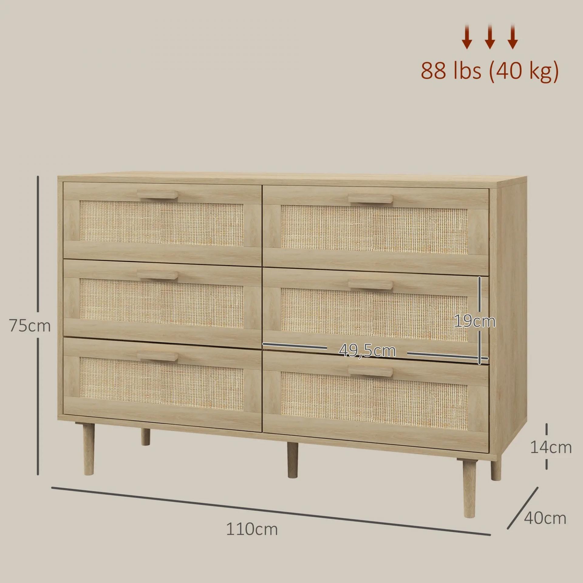 Cómoda para Dormitorio con 6 Cajones con Frontal de Ratán Patas de Madera Cajonera Estilo Bohemio 110x40x75 cm Roble