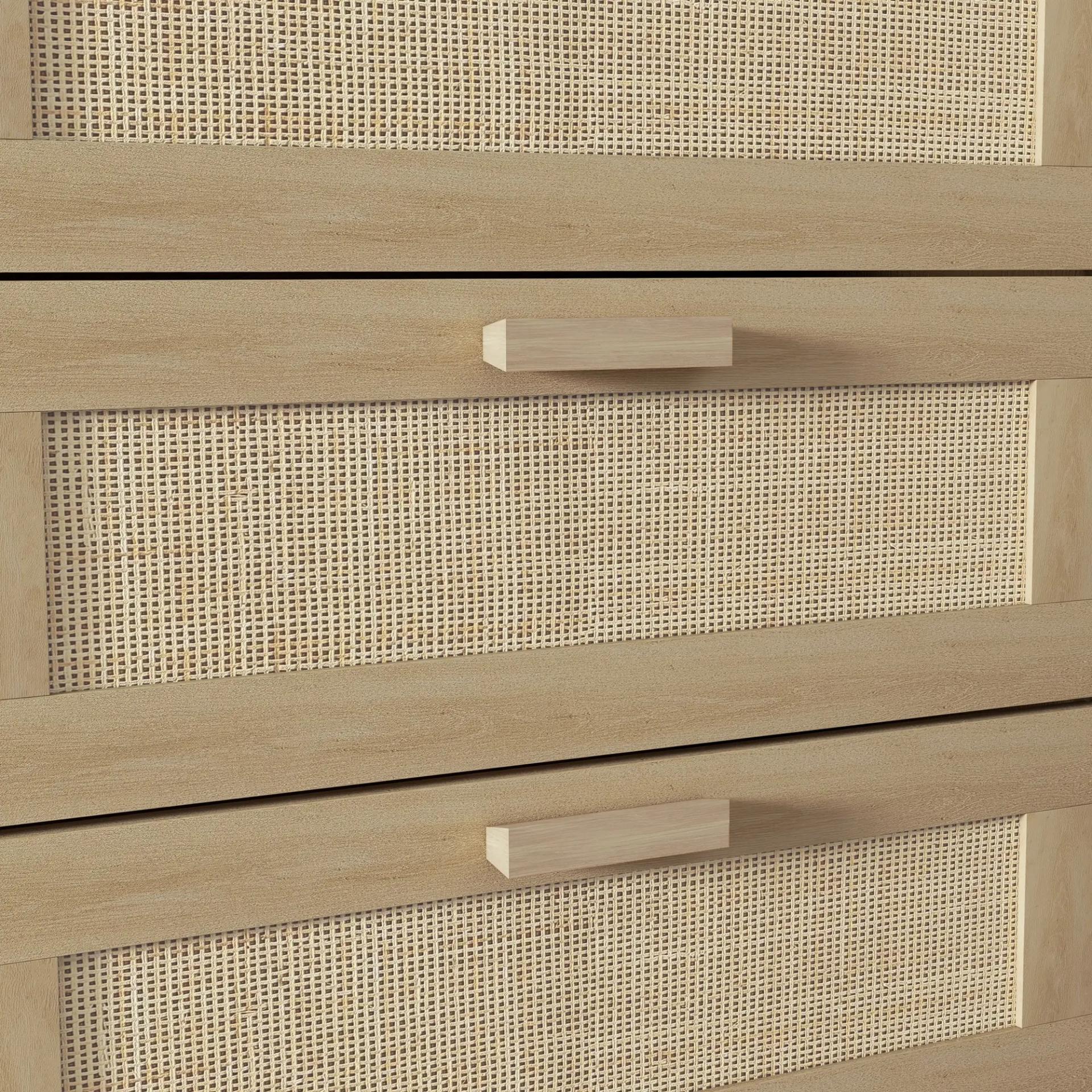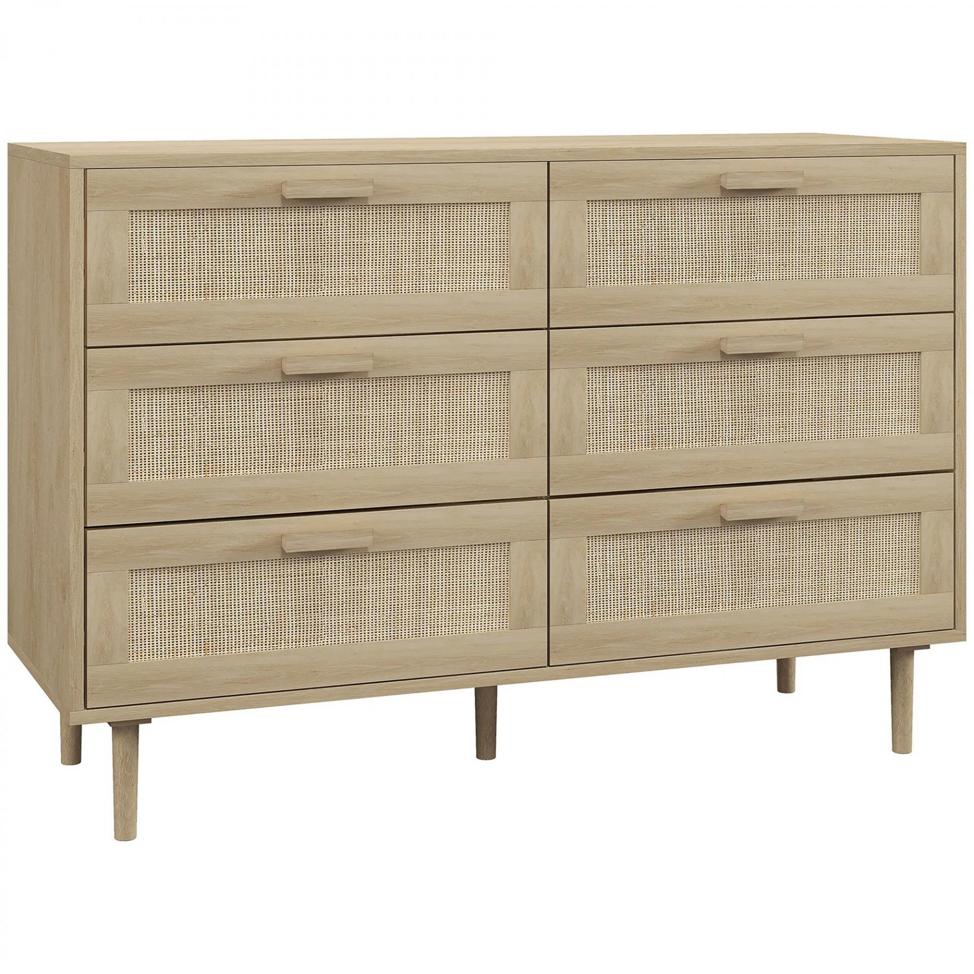 CÓMODA CON DETALLES DE RATÁN: Esta cómoda de seis cajones combina el estilo moderno con un toque boho gracias al ratán decorativo en el frontal de cada cajón y su acabado en color roble natural
