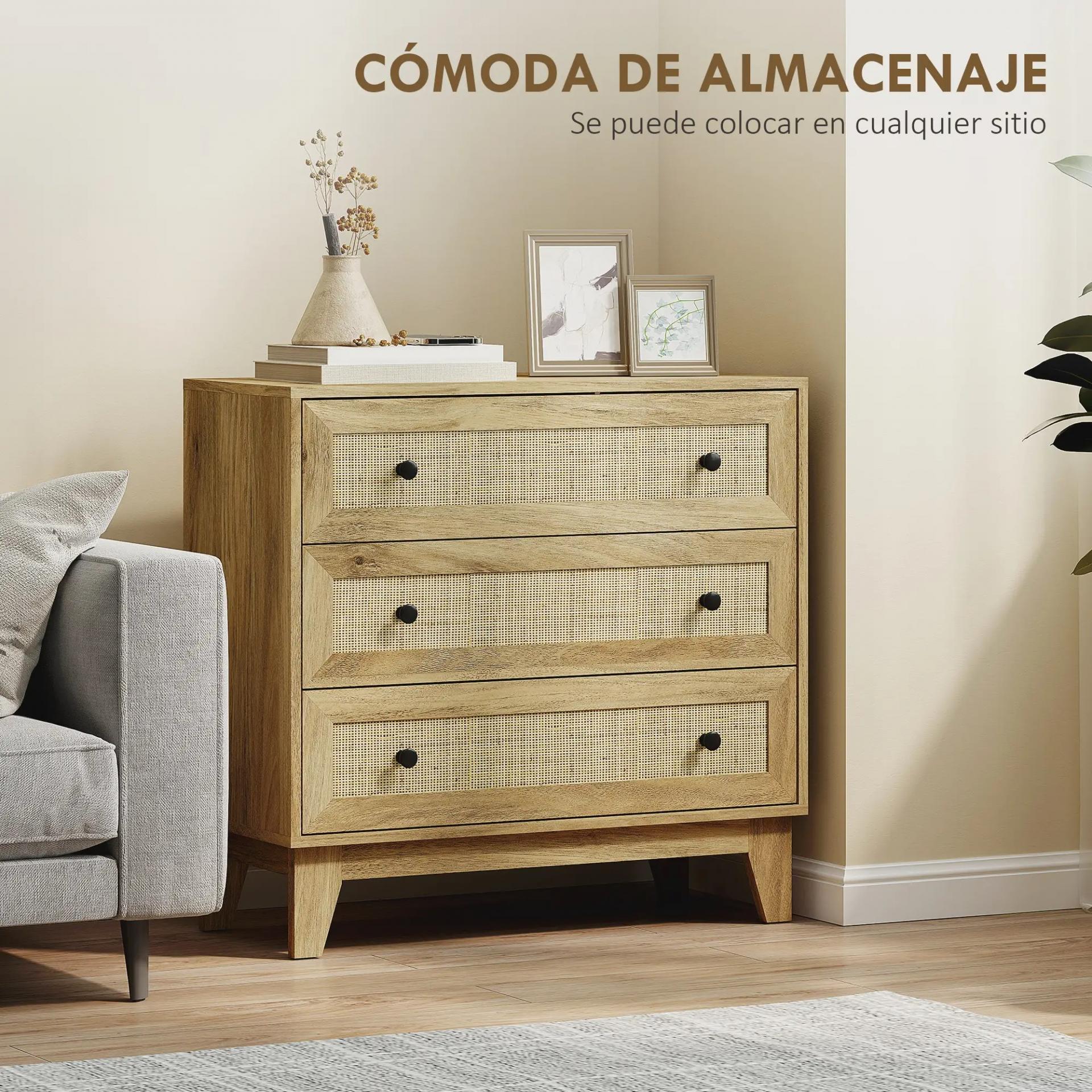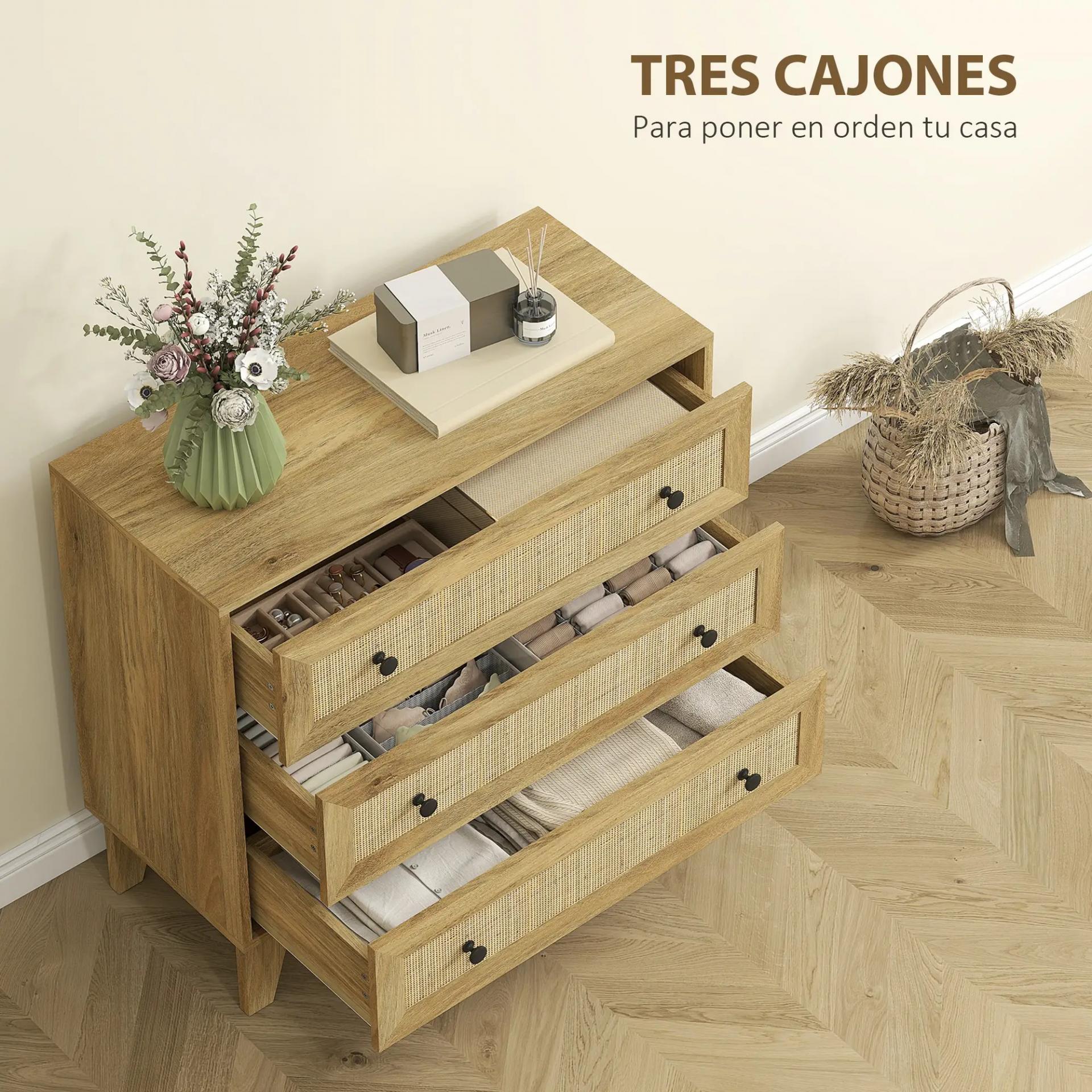 - TRES CAJONES: ¿Buscas más espacio en tu dormitorio? Esta cómoda con 3 cajones de frontales de ratán te permite guardar camisetas, calcetines o bufandas, y usar la encimera para una lámpara o decoración. Ideal para mantener el orden