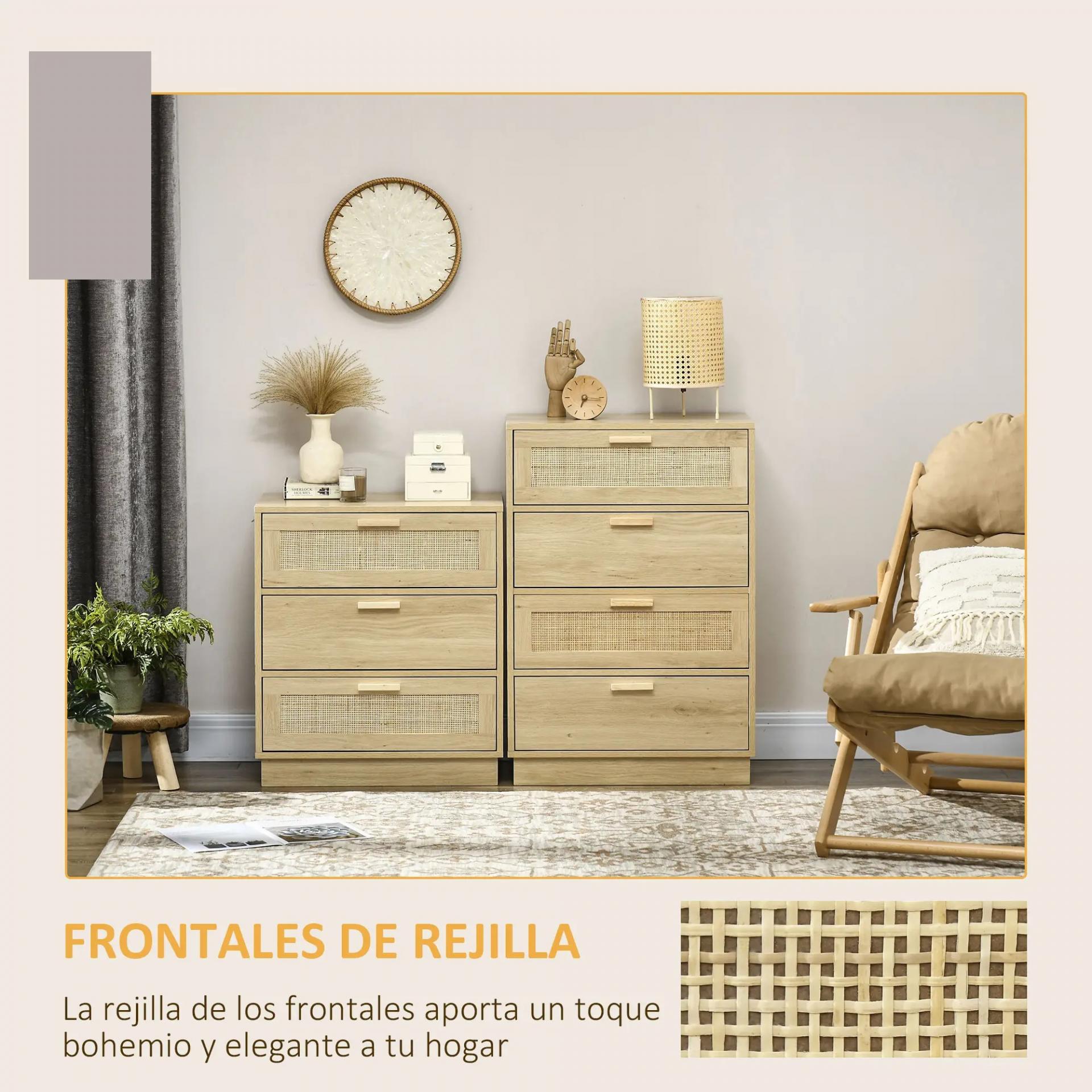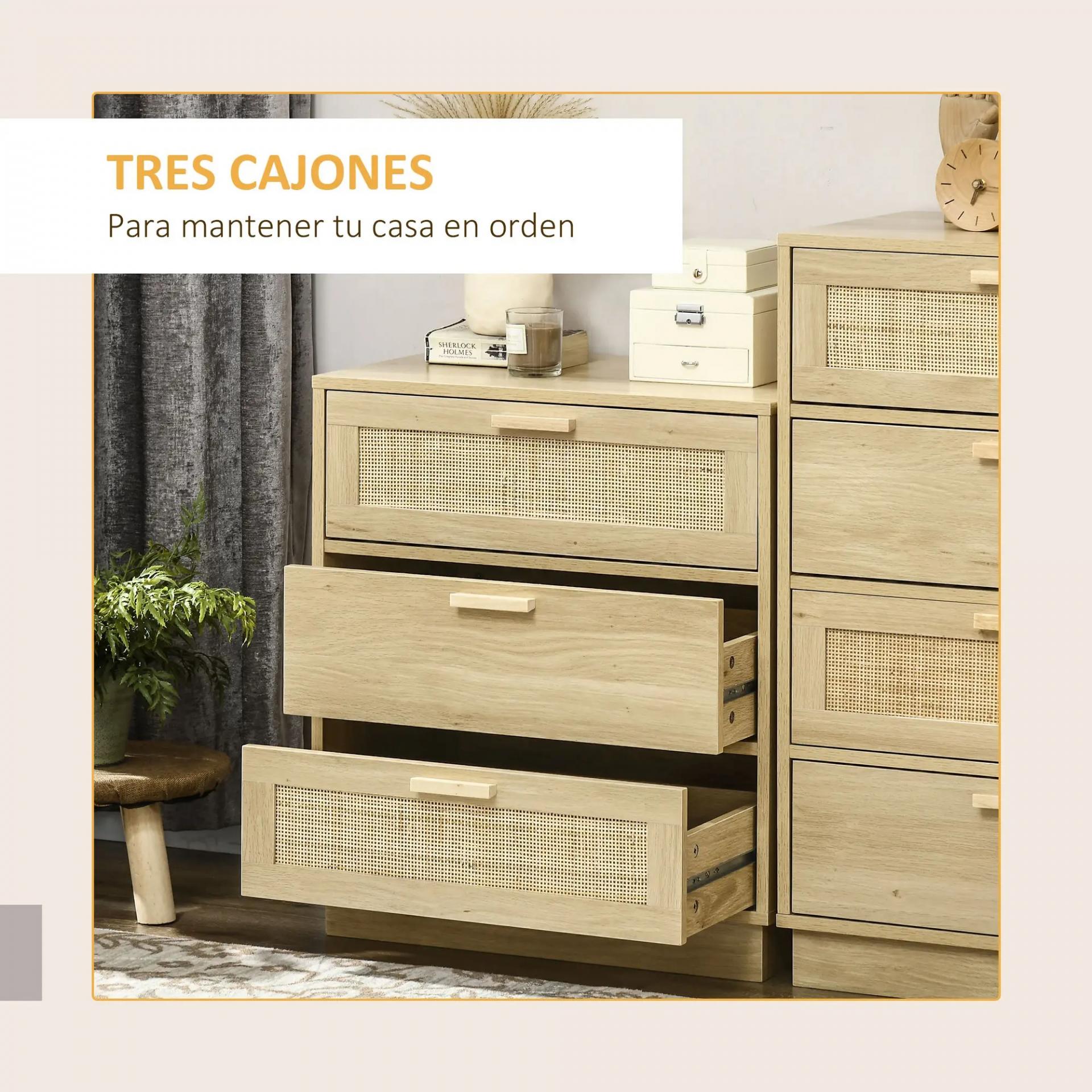 Cómoda con 3 Cajones de Rejilla de Ratán Cajonera de Madera para Dormitorio Estilo Cannage Bohemio 60x38x69 cm Natural