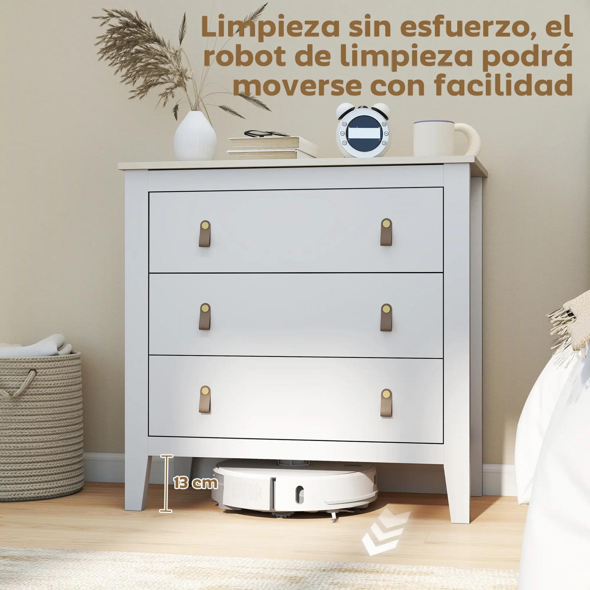 SEGURIDAD Y ESTABILIDAD GARANTIZADAS: Equipado con dispositivo antivuelco para fijar a la pared. Altura libre de 13 cm que permite el paso de robots aspiradores. Medidas totales: 80x40x78,5 cm. Cada cajón soporta 8 kg. Requiere montaje
