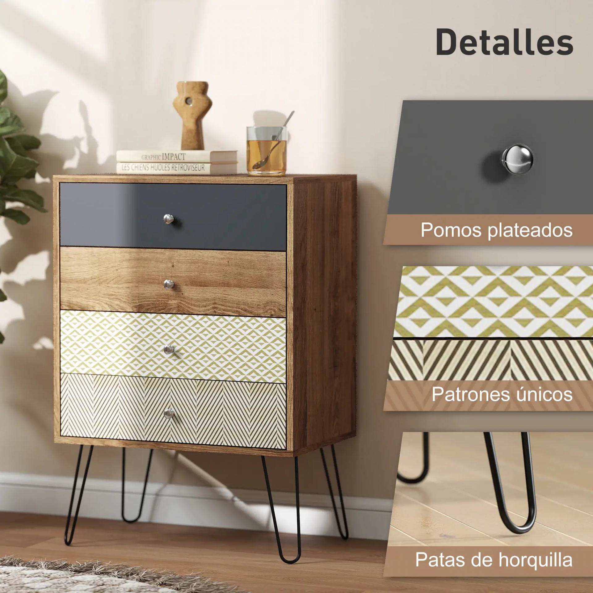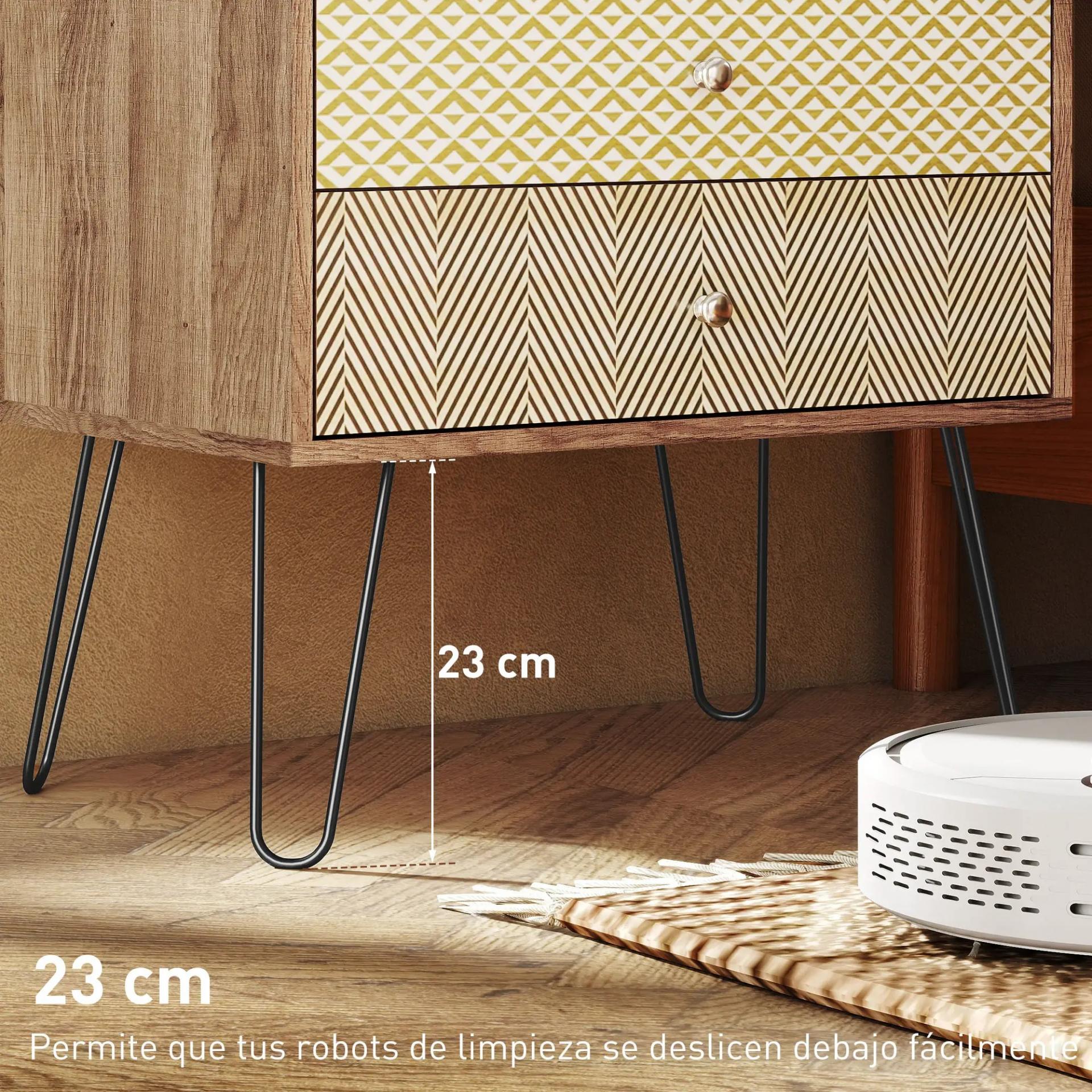 - DISEÑO ARTÍSTICO: La cómoda para dormitorio combina tonos cálidos de madera con frentes geométricos decorativos y patas metálicas finas en forma de V. Su estilo boho-vintage convierte el mueble en una pieza llamativa que aporta personalidad a cualquier estancia