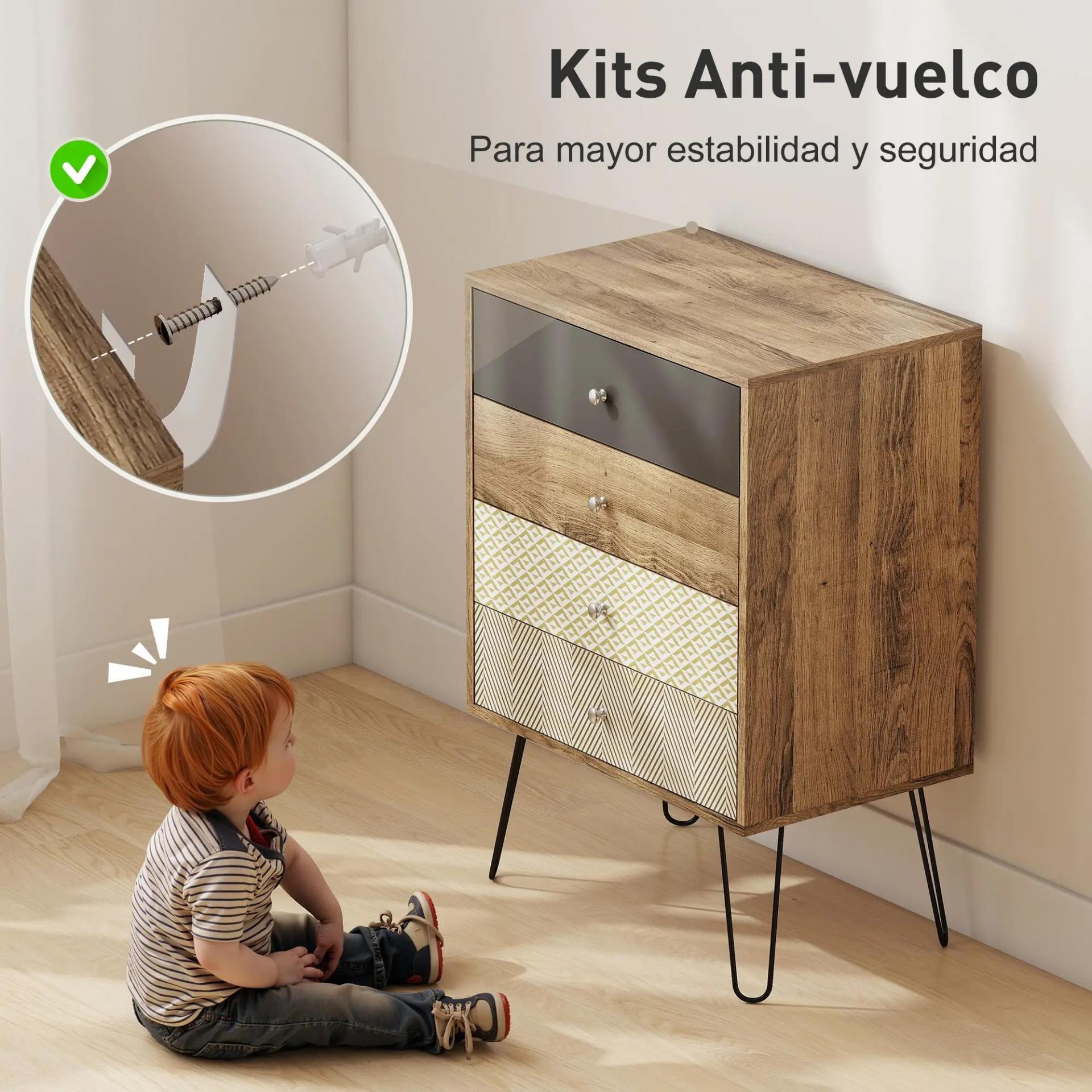 - RESISTENTE Y SEGURA: Fabricada en melamina de madera con patas de acero robustas y equipada con antivuelco, esta cajonera para dormitorio garantiza estabilidad y seguridad. Su estructura firme permite almacenar con confianza ropa y accesorios diarios