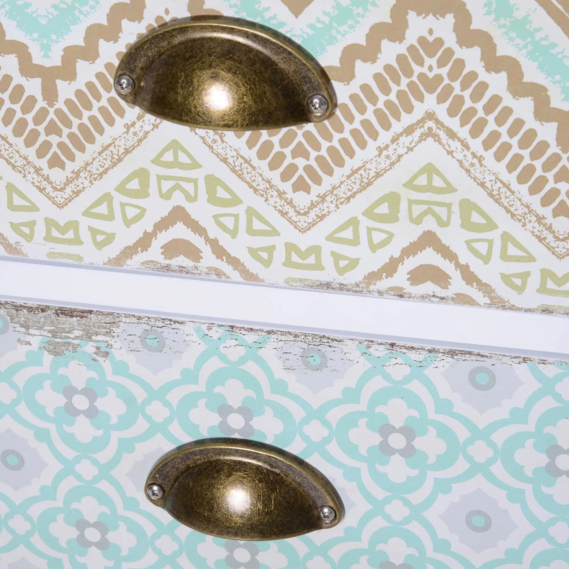 ESTILO VINTAGE: Los cinco cajones de esta cómoda de dormitorio son coloridos y están cubiertos con diferentes patrones. Además, los bordes de los cajones en estilo vintage rústico le dan a este mueble un aspecto antiguo y desgastado