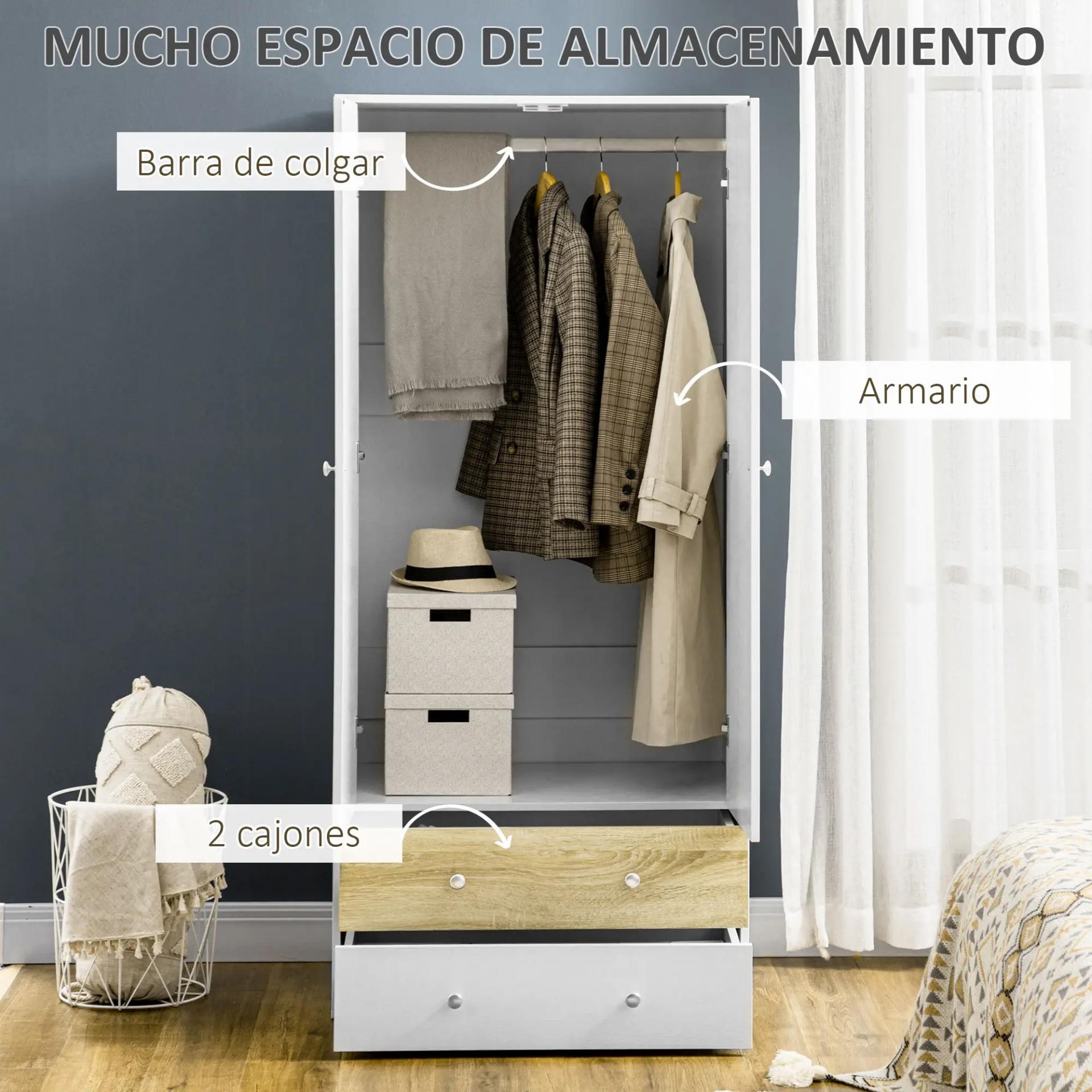 Armario de Ropa con 2 Puertas 2 Cajones y 1 Barra para Colgar Estilo Moderno para Dormitorio 80x50x180 cm Blanco y Roble