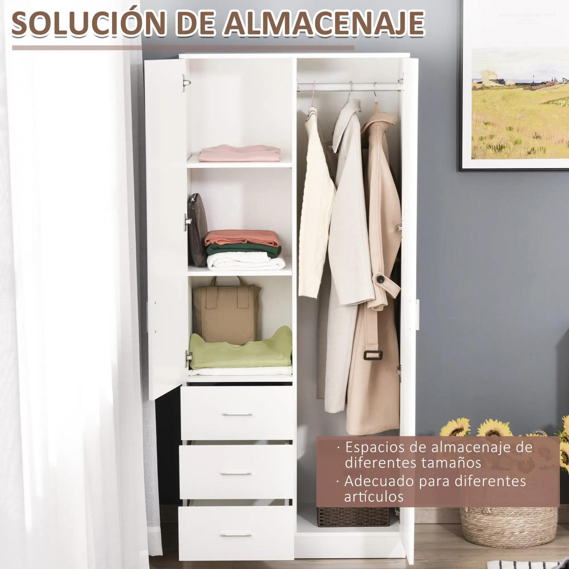 - AMPLIO ESPACIO DE ALMACENAJE: Este armario destaca por su funcionalidad. Con 3 cajones para tener organizada tu ropa interior y calcetines, una barra para colgar, abrigos, chaquetas, etc. y 3 compartimentos para tener tus pantalones, camisetas doblados y organizados