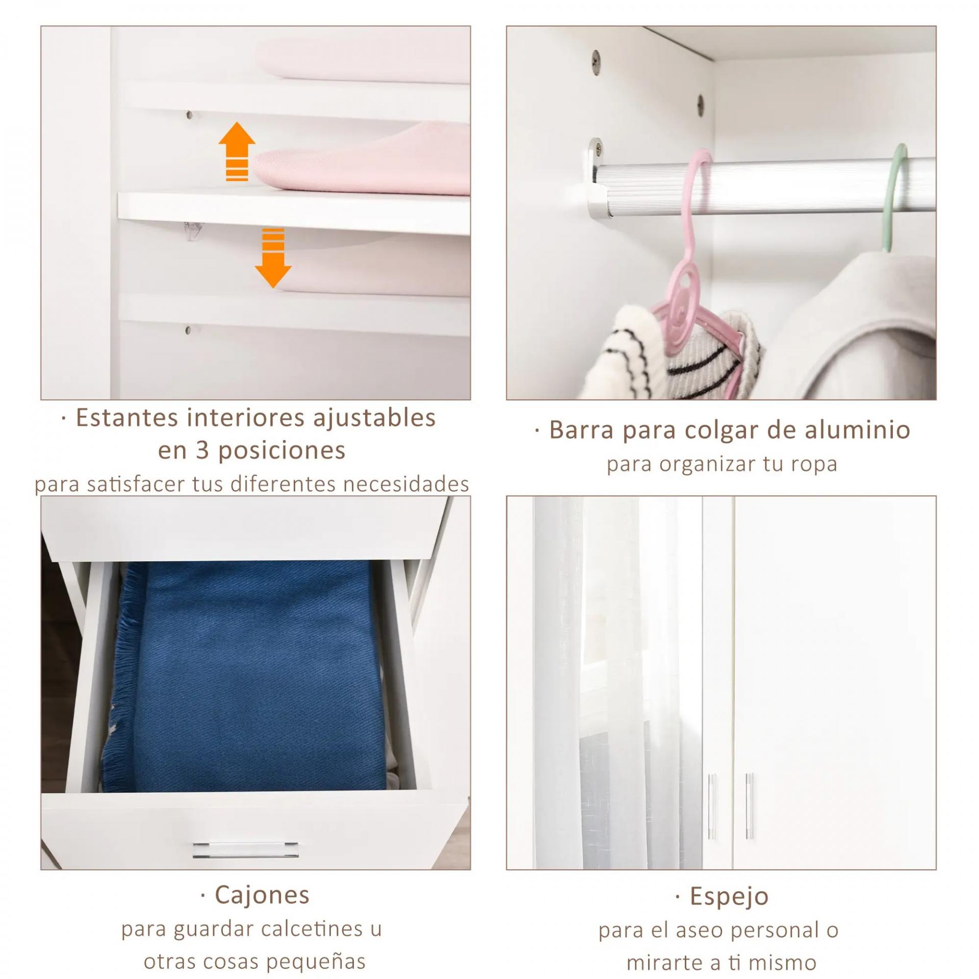 Armario Ropero de 2 Puertas con Espejo 3 Cajones Estantes Ajustables y Barra para Colgar Incluida 80x50x180 cm Blanco