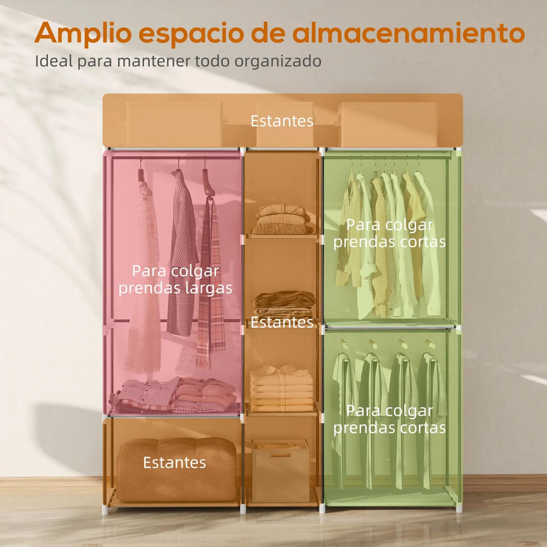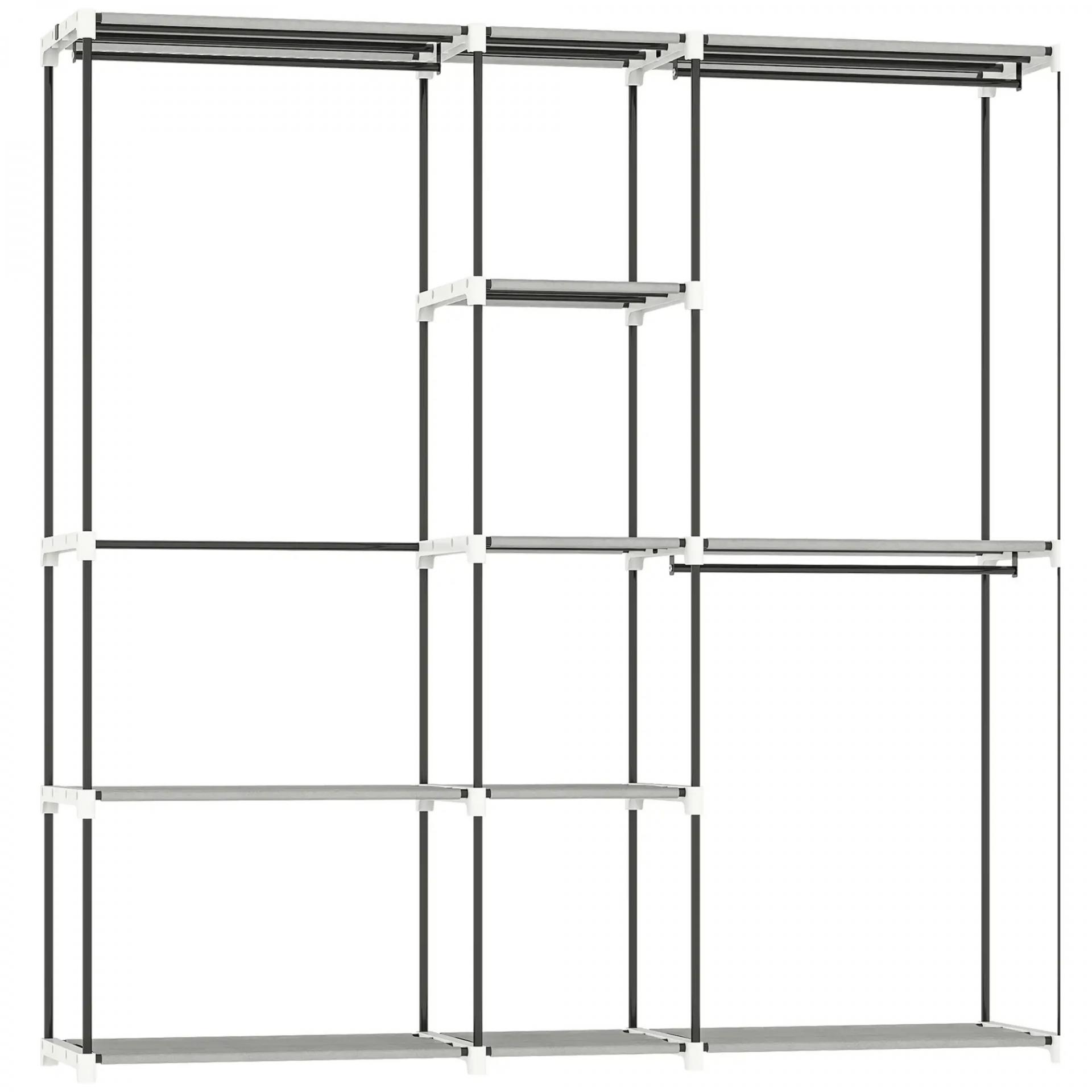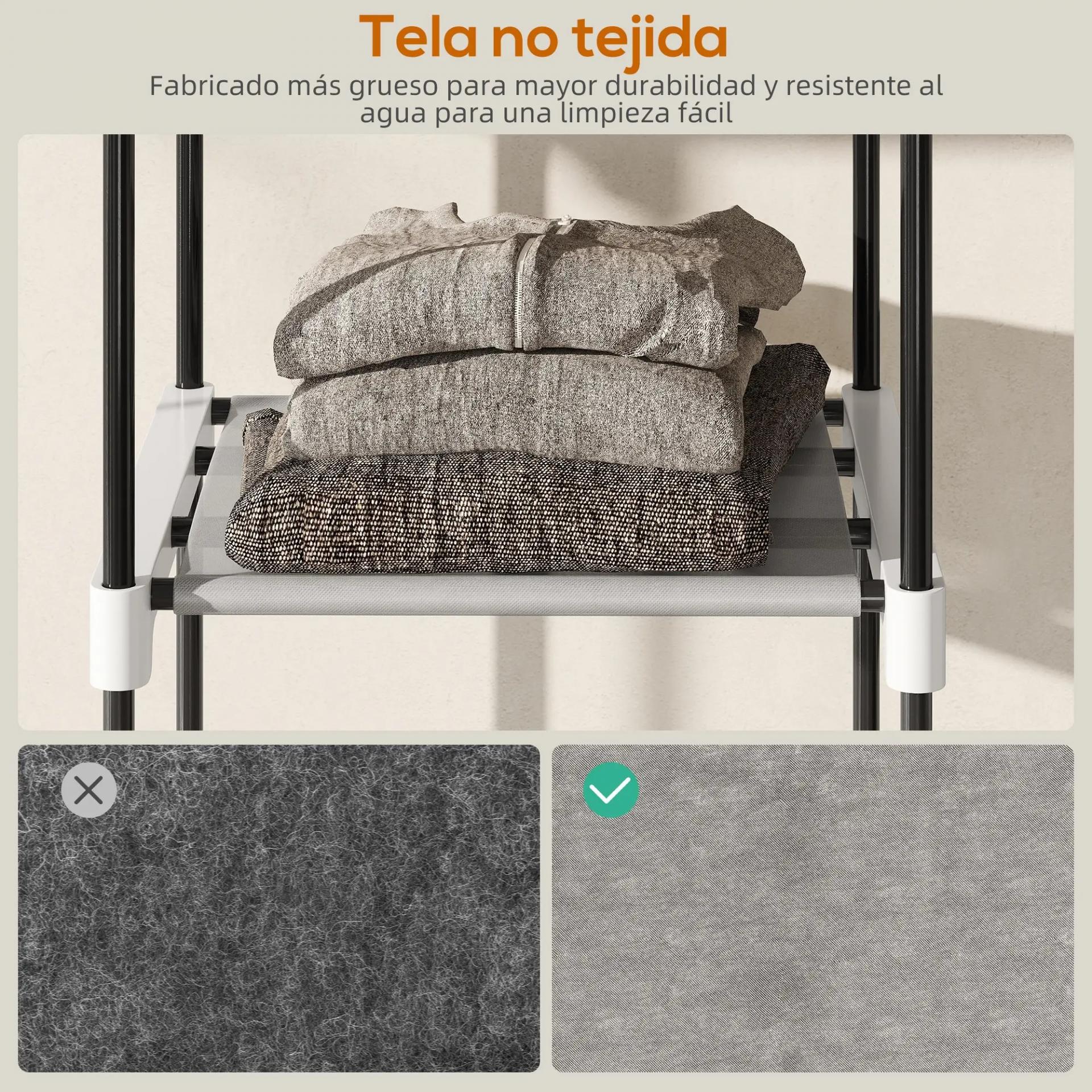 - ESTRUCTURA RESISTENTE: Este armario para ropa de HOMCOM está fabricado con tubos de metal de 16 mm y tela no tejida, garantizando soporte firme. Cada estante grande soporta 10 kg, cada pequeño 5 kg y cada barra 15 kg, con capacidad total de 120 kg