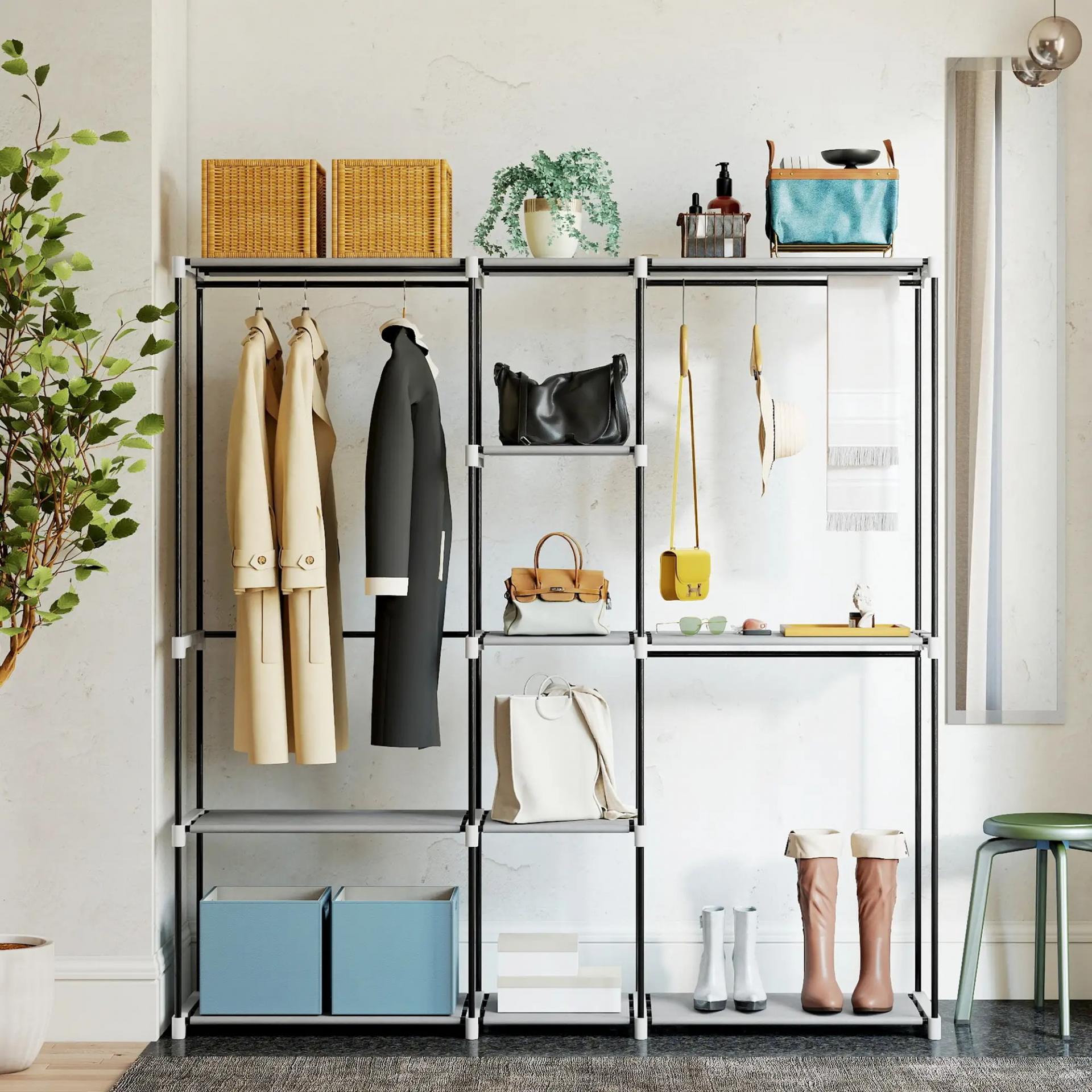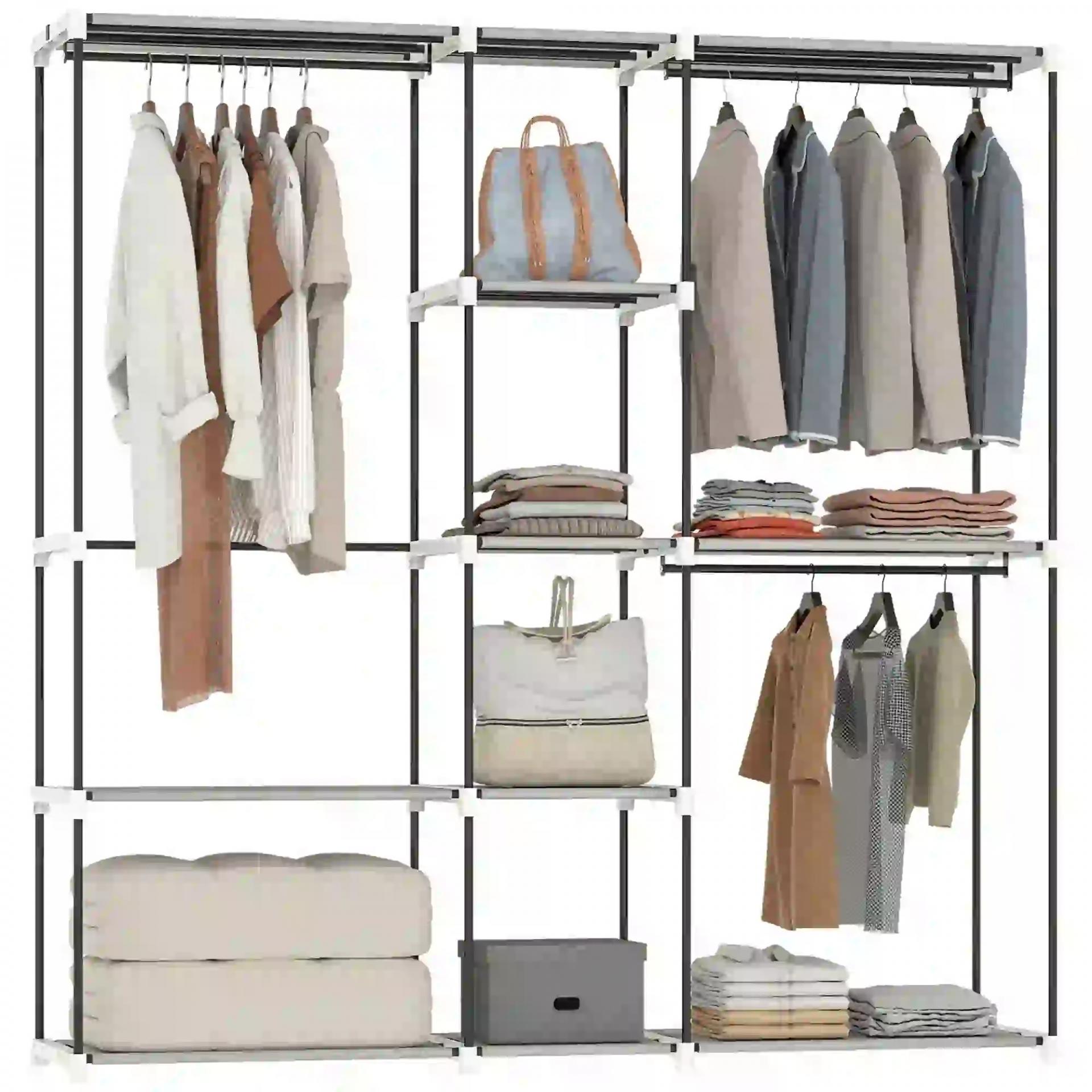 Armario de Ropa 182x43x185 cm Armario Abierto con 8 Estantes de Tela Barras para Colgar Marco de Metal Gris Claro