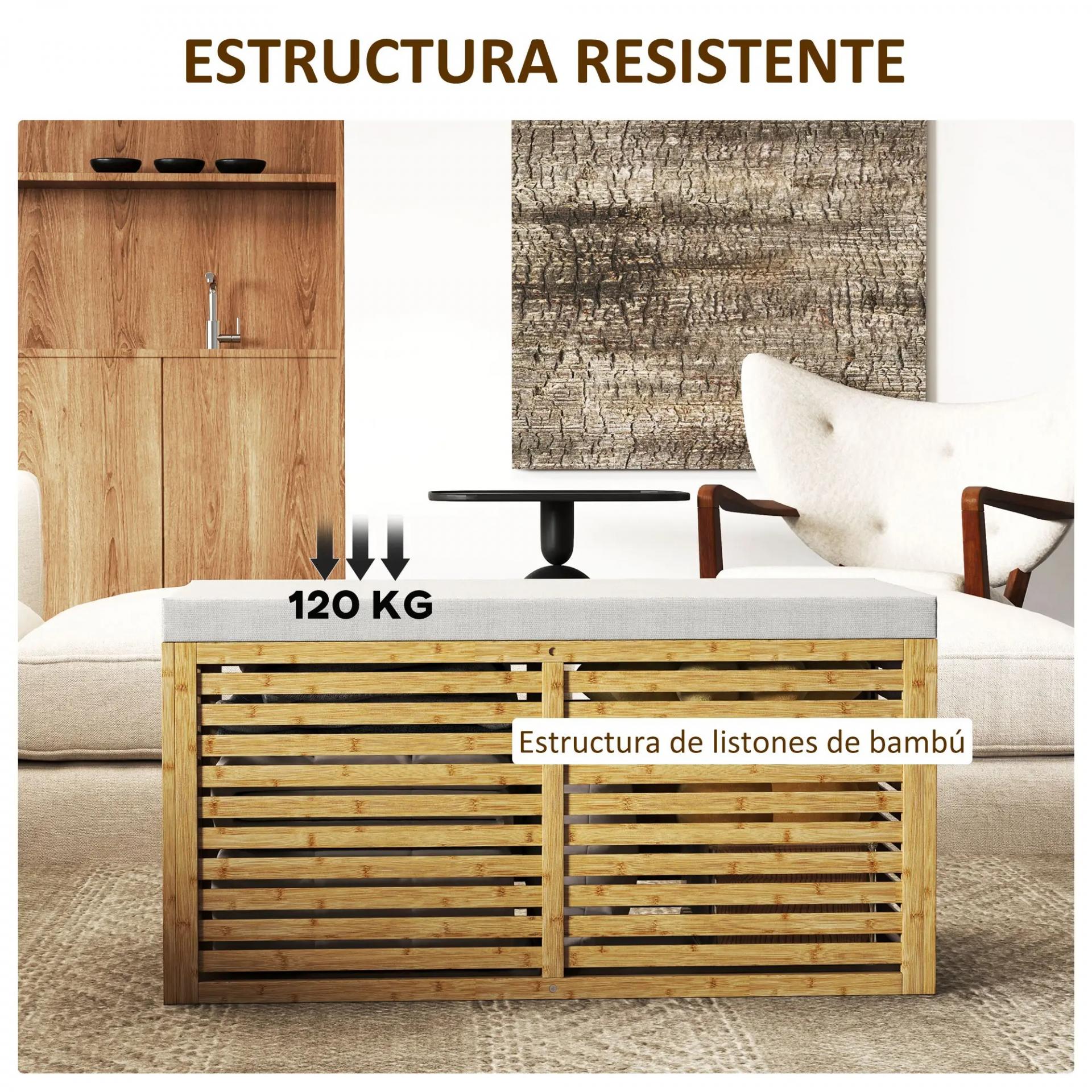 Baúl de Almacenaje 122L Tapizado en Lino Sintético con Cojín Marco de Bambú 90x42x43 cm Gris y Natural