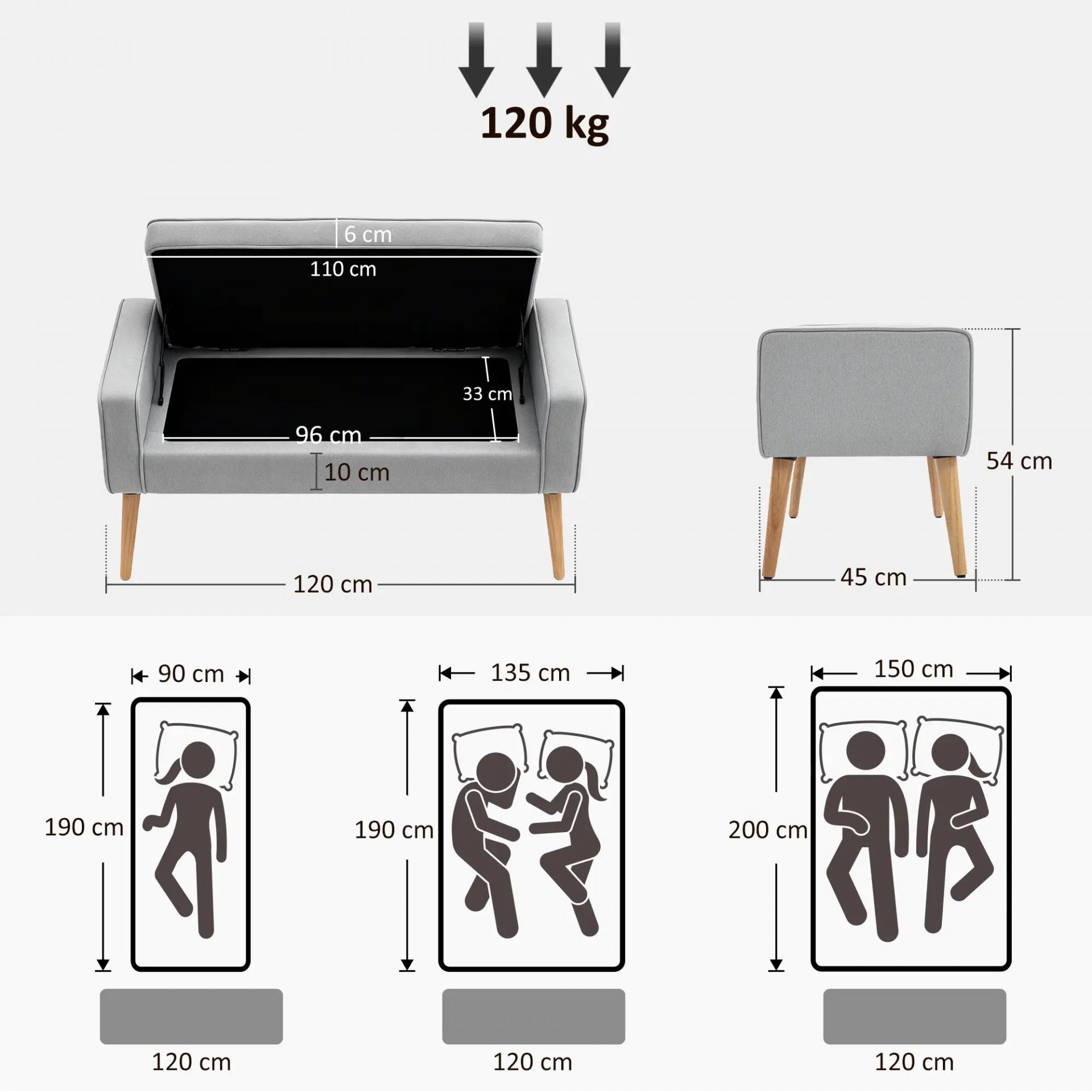 Banco de Almacenaje con Tapa Abatible y Patas de Madera para Dormitorio Salón Entrada 120x45x54 cm Gris Claro