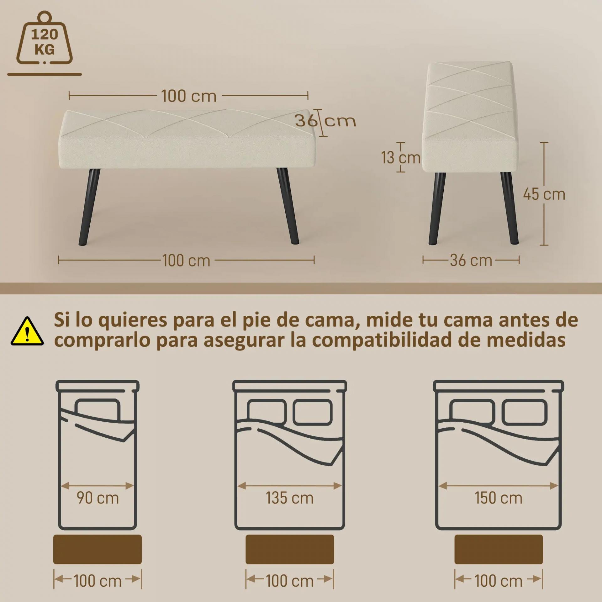 Taburete Pie de Cama Multifuncional con Pies de Acero y Asiento Acolchado para Entrada Pasillo 100x36x45 cm Blanco Crema