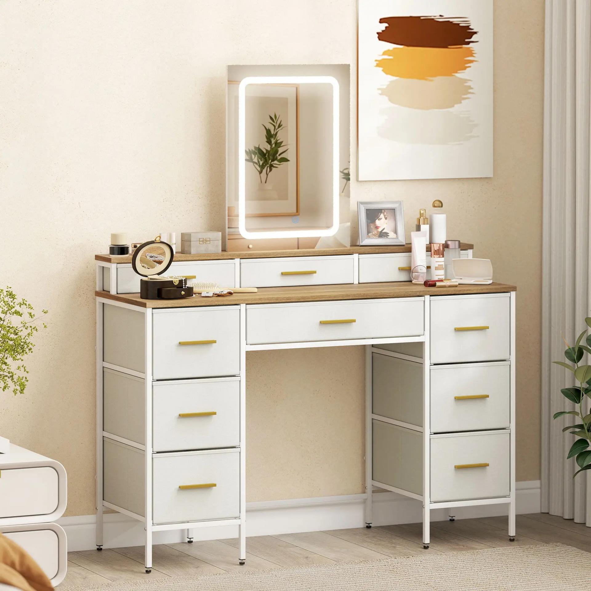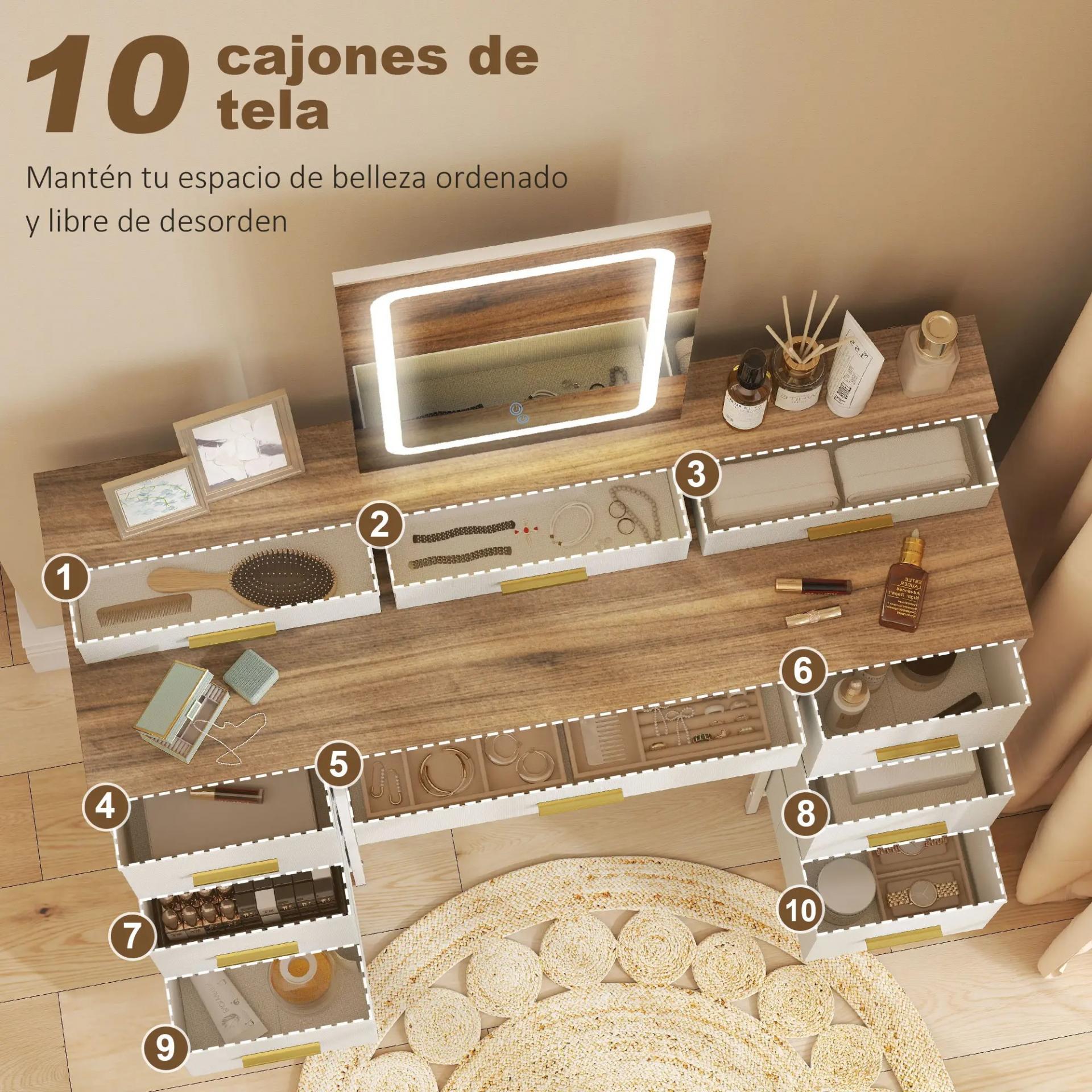 Tocador de Maquillaje con Luces LED de 3 Colores Espejo Tocador con 10 Cajones de Tela Patas de Acero Natural
