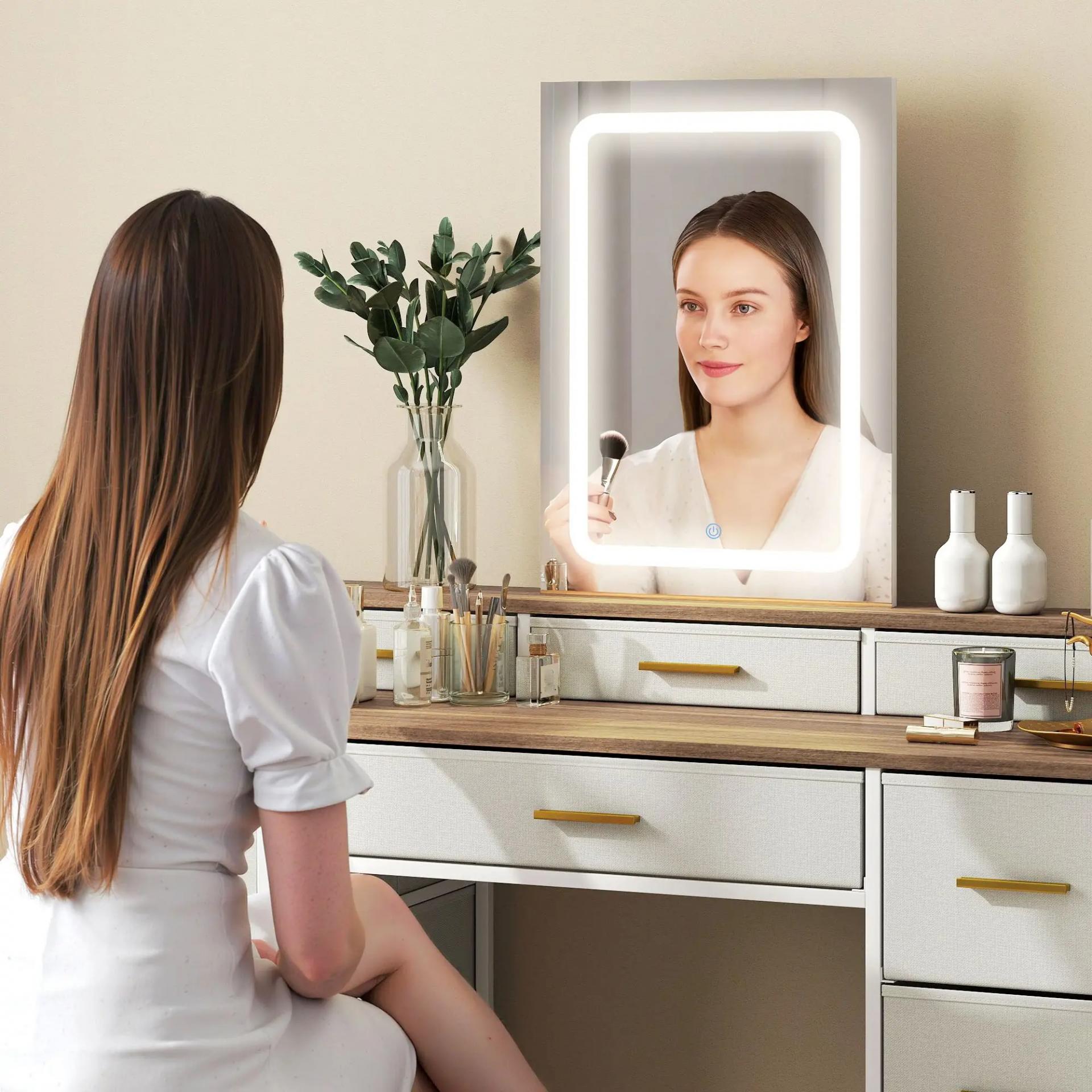 LUZ LED AJUSTABLE: Este tocador cuenta con un espejo de 55x40 cm con luz LED integrada, que puede seleccionarse entre cálida, fría o natural con un solo toque, garantizando maquillaje perfecto en cualquier momento del día