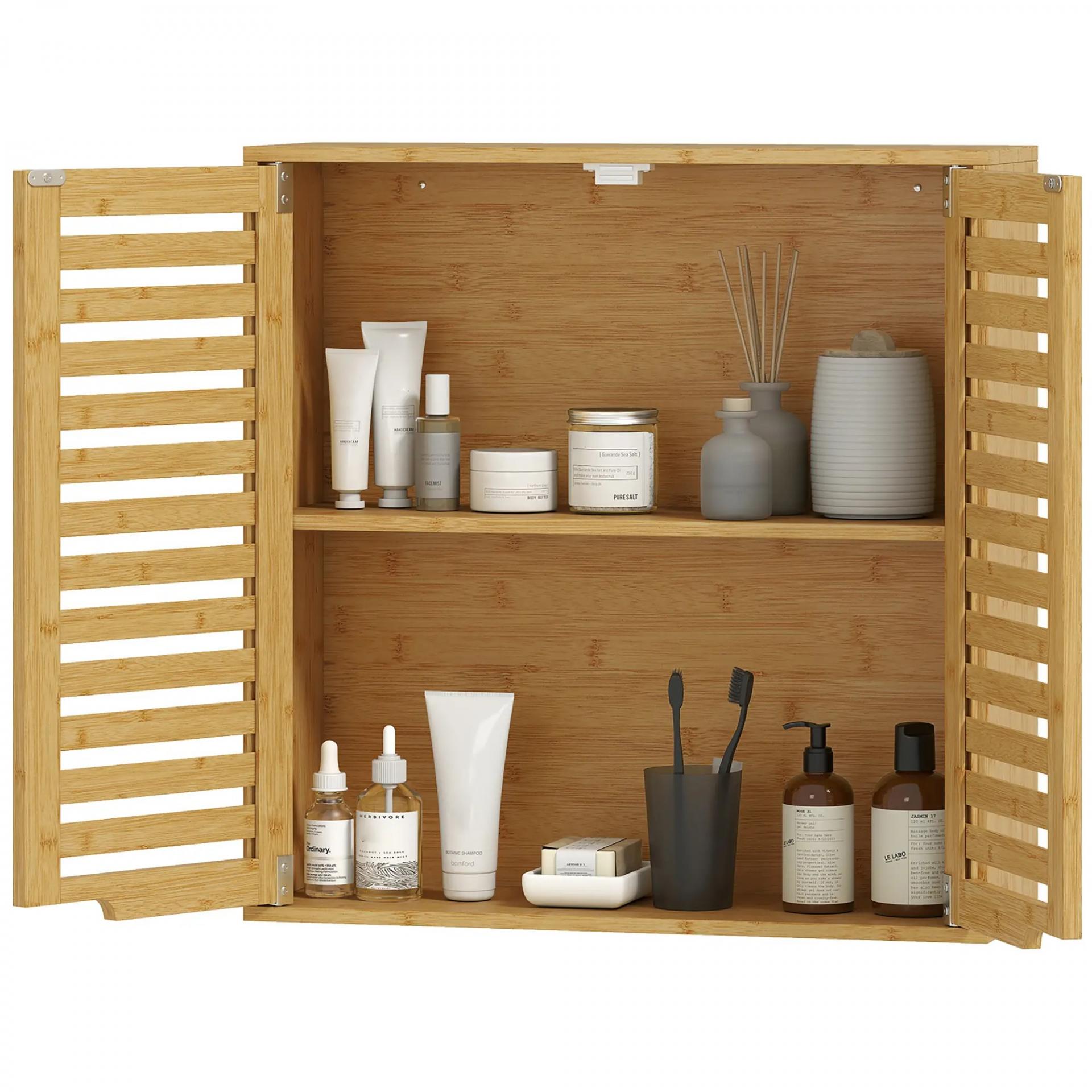 Armario de Baño de Pared de Bambú Mueble de Baño Colgante con Estante Ajustable Puertas de Lamas Natural