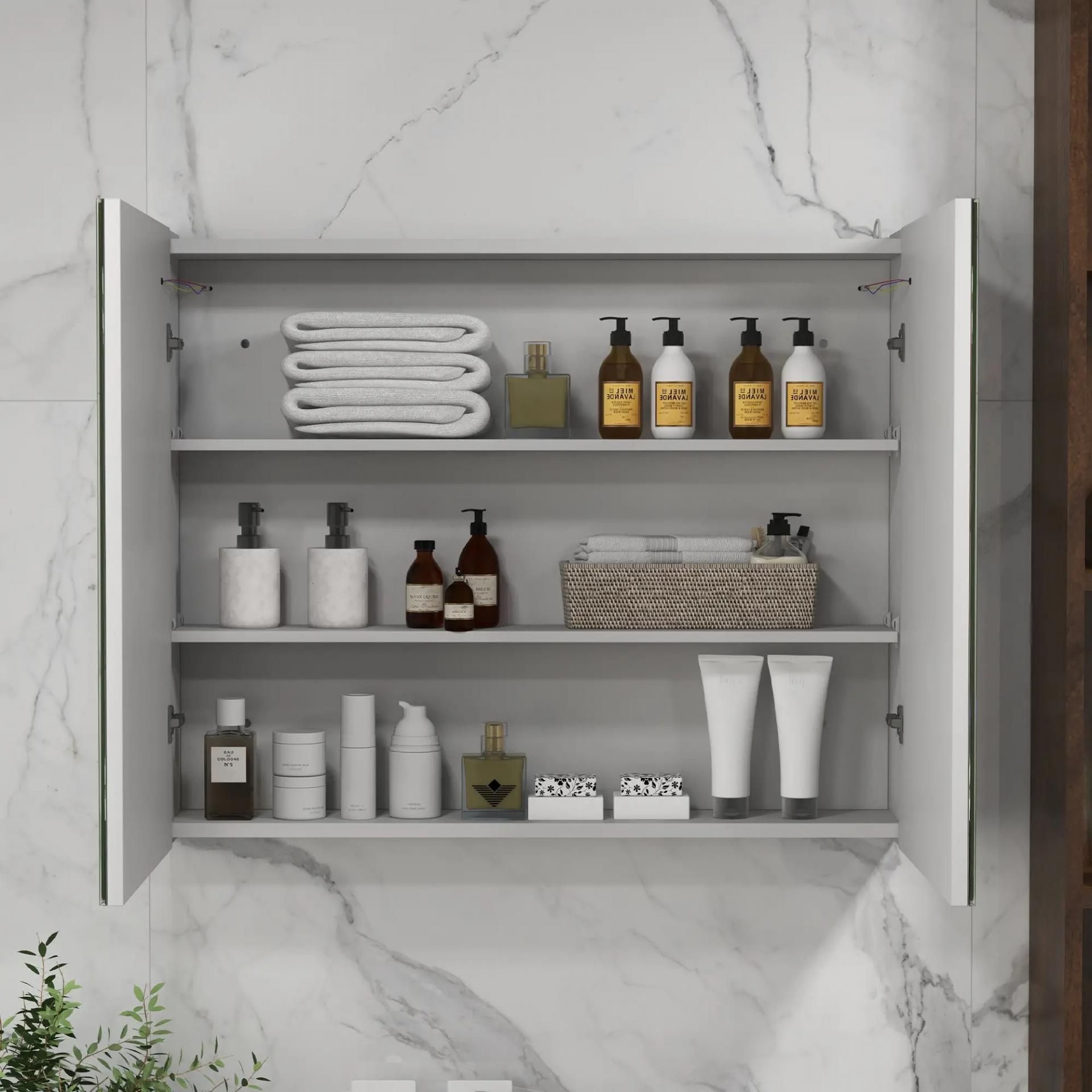 - ILUMINACIÓN INTELIGENTE: Este armario con espejo para baño, cuenta con iluminación LED en tres colores: blanco, blanco cálido y amarillo, alimentada por USB. Gracias al interruptor táctil podrás encender/apagar y ajustar según tus preferencias